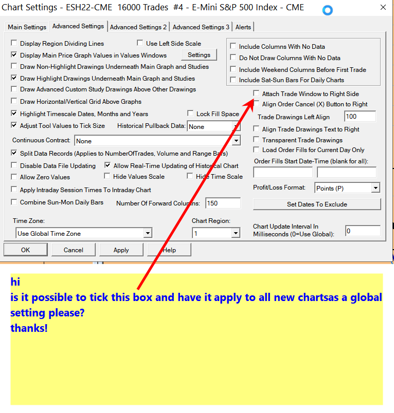 Only through a template. Refer to: Using Chart Templates Sierra Chart Support - Engineering Level Your definitive source for support. Other responses are from users. Try to keep your questions brief and to the point. Be aware of support policy: https://www.sierrachart.com/index.php?l=PostingInformation.php#GeneralInformation For the most reliable, advanced, and zero cost futures order routing, use the Teton service: Sierra Chart Teton Futures Order Routing |