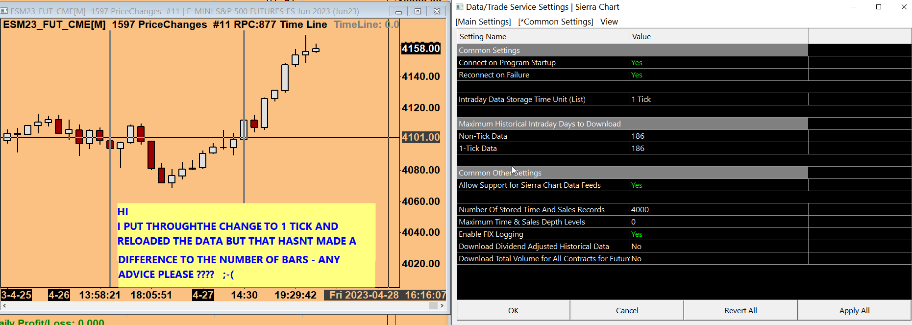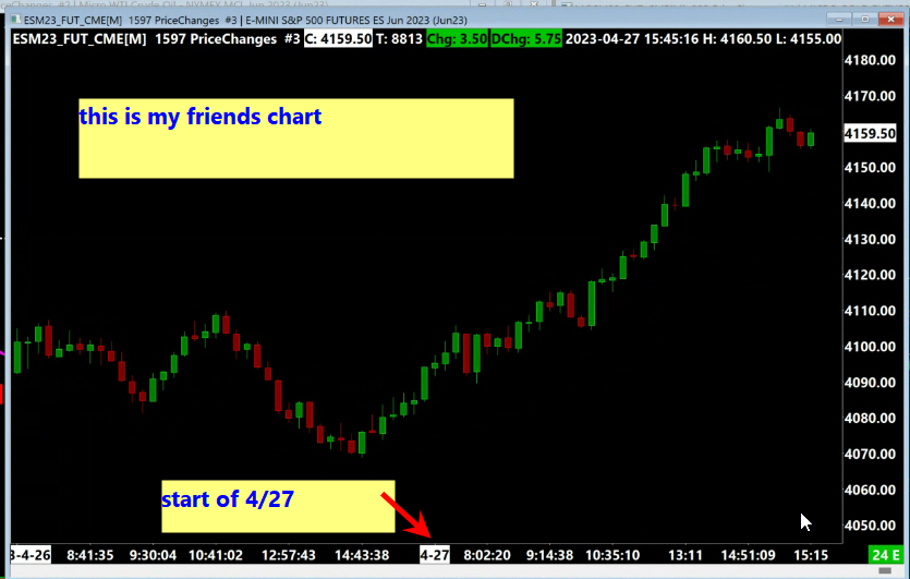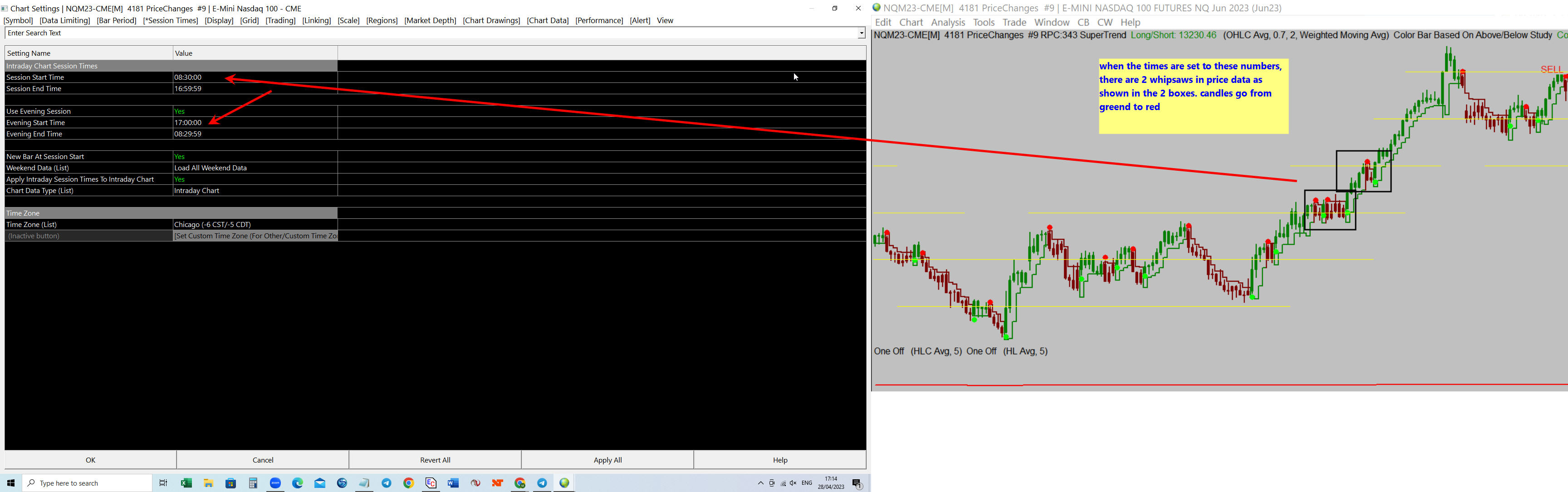 Hi, I can illustrate the issue in 2 images. Please refer to the attached files. The questions I have are: Why would making such a change to the session times affect price this way if both session times were 24hrs? What is the 'correct' session time to use? Sierra is obviously doing something to change the way the price data displays. Let me know if you need more information. Cheers Date Time Of Last Edit: 2023-04-28 16:21:22