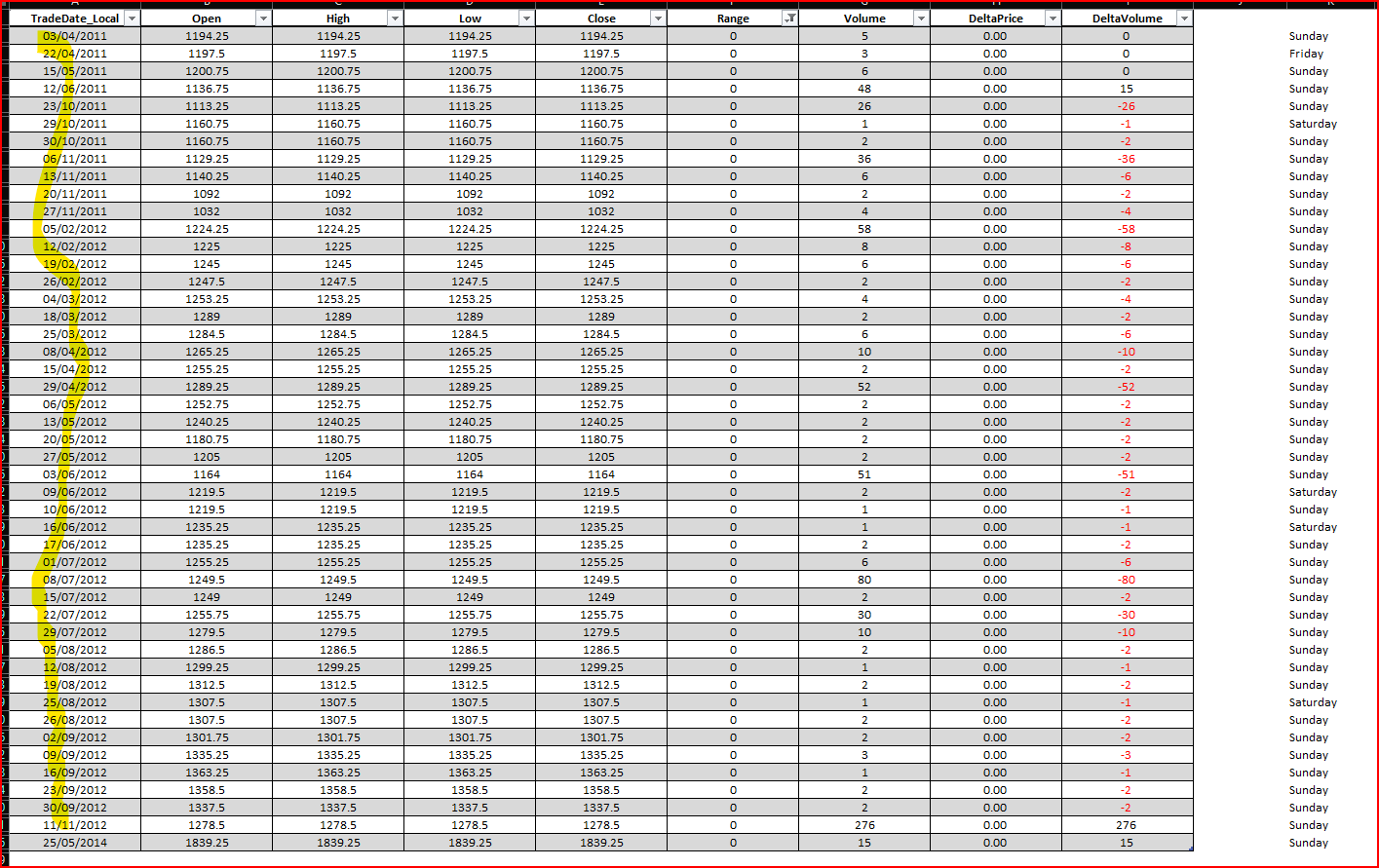 That is going back a long time ago. Data that far back perhaps does have some data on Saturday and Sunday before the Sunday evening open. It would have to be exchange test data. We really cannot help with data that far back in time. Although we should be able to filter out the Saturday data but Sunday might be difficult. Sierra Chart Support - Engineering Level Your definitive source for support. Other responses are from users. Try to keep your questions brief and to the point. Be aware of support policy: https://www.sierrachart.com/index.php?l=PostingInformation.php#GeneralInformation For the most reliable, advanced, and zero cost futures order routing, use the Teton service: Sierra Chart Teton Futures Order Routing Date Time Of Last Edit: 2023-05-01 17:17:12