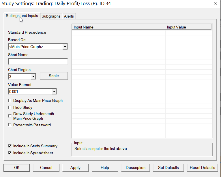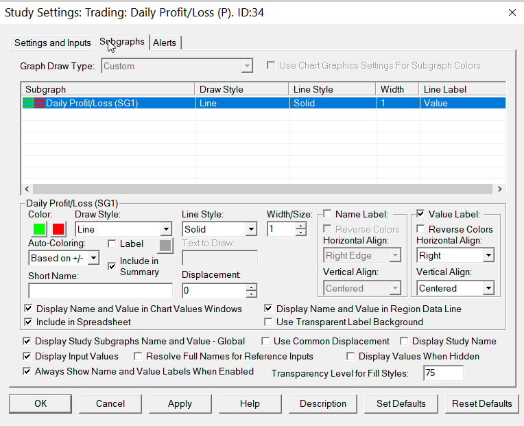 What we recommend you do is do an accelerated chart replay with this study on the chart, and submit an order, to create position and then close that position with Flatten. The study will show at the time you close the position, the same Profit/Loss value you will see on the Trade Window DPL field.