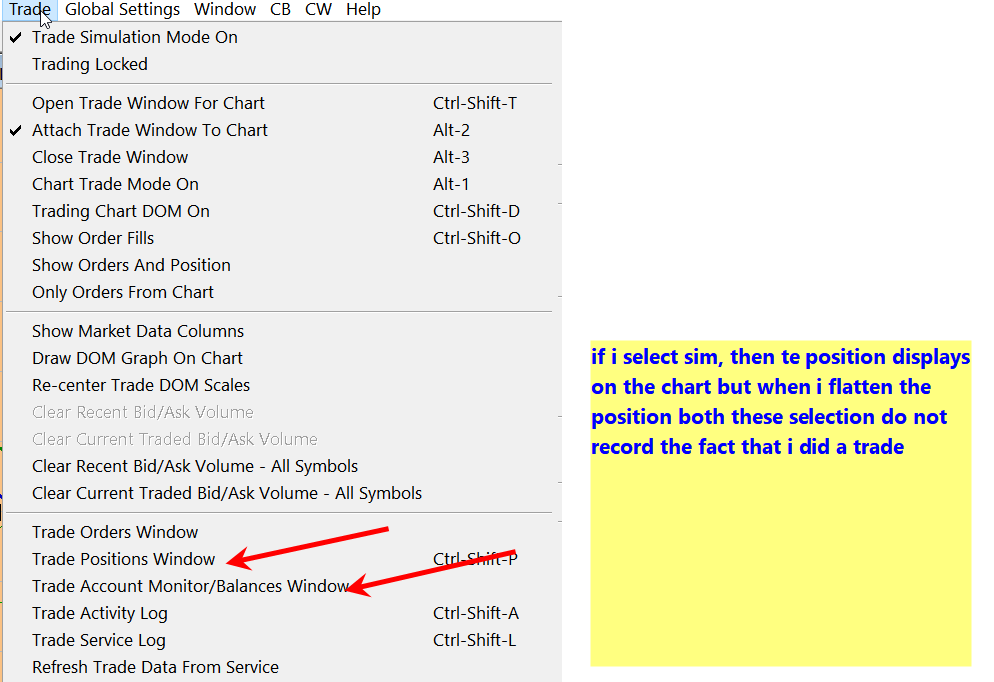 That is true. The documentation, explains this for those windows: Trading Information Windows More information here: Trade Simulation: Viewing Positions and Current Profit/Loss Sierra Chart Support - Engineering Level Your definitive source for support. Other responses are from users. Try to keep your questions brief and to the point. Be aware of support policy: https://www.sierrachart.com/index.php?l=PostingInformation.php#GeneralInformation For the most reliable, advanced, and zero cost futures order routing, use the Teton service: Sierra Chart Teton Futures Order Routing Date Time Of Last Edit: 2023-04-30 17:32:33