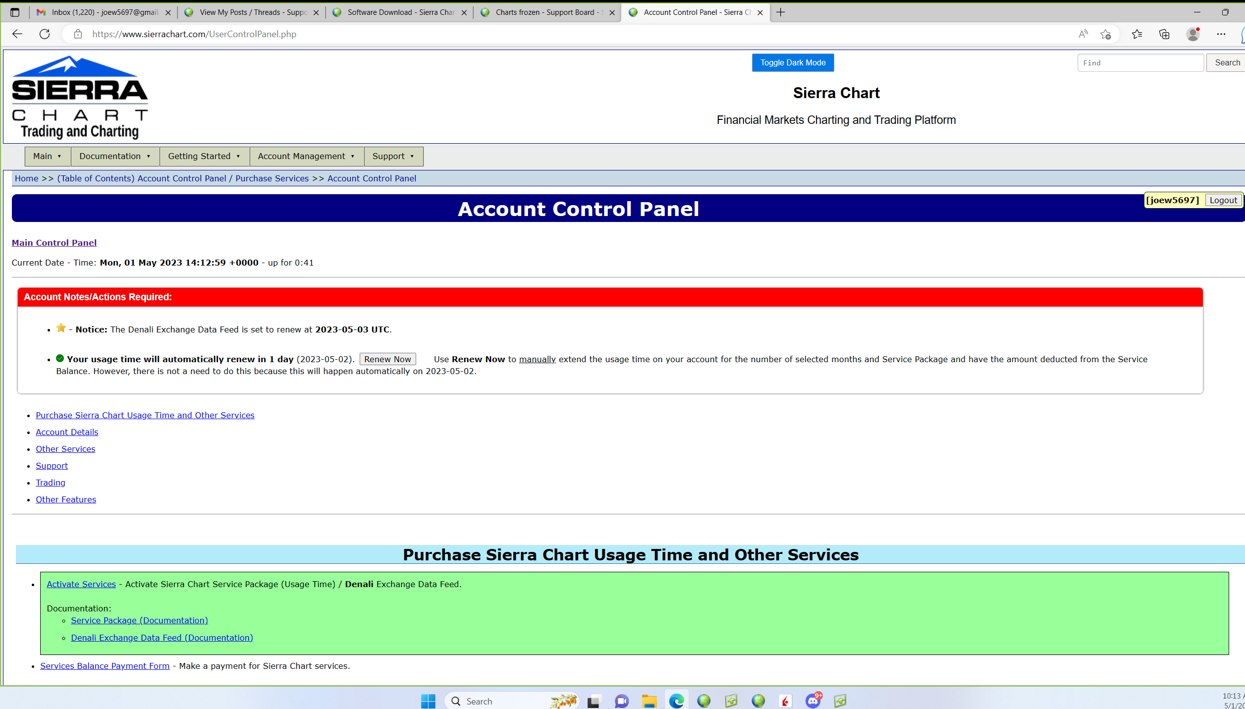 There are two different items. One is your Sierra Chart Usage Time. This works on a 31 day cycle and renews based on when you started using Sierra Chart. This Usage Time is set to renew on May 2, 2023. The other item are the exchange fees. These work on a calendar month basis and renew on the first day of each month. You had deactivated the exchanges, so they did not renew today (May 1, 2023). You can reactivate the exchange(s) you want at the following link: https://www.sierrachart.com/UserControlPanel.php?page=DenaliDataFeed#Exchanges Note that the "Full CME Group" exchange is already active. For the most reliable, advanced, and zero cost futures order routing, use the Teton service: Sierra Chart Teton Futures Order Routing |