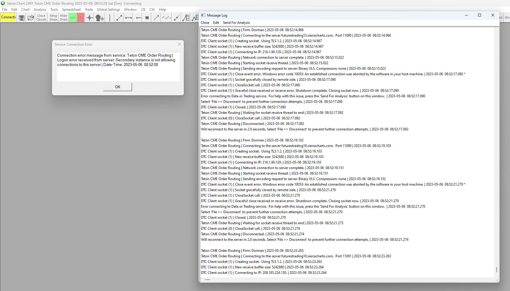 Teton order routing was down for maintenance earlier today. You will be able to connect now. Sierra Chart Support - Engineering Level Your definitive source for support. Other responses are from users. Try to keep your questions brief and to the point. Be aware of support policy: https://www.sierrachart.com/index.php?l=PostingInformation.php#GeneralInformation For the most reliable, advanced, and zero cost futures order routing, use the Teton service: Sierra Chart Teton Futures Order Routing Date Time Of Last Edit: 2023-05-06 14:47:39