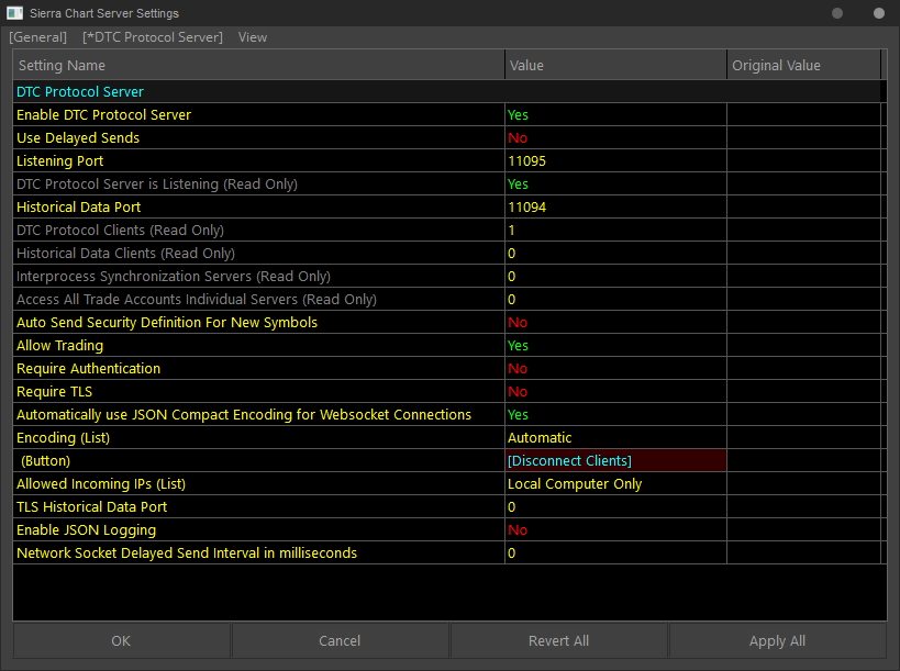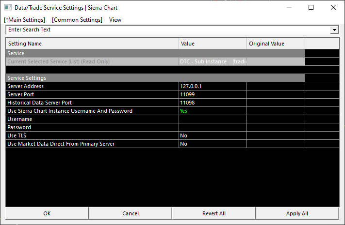 Nicktrader, That seems ok. Make sure that you have "Listening Port" and "Historical Data Port" on "Sierra Chart Server Settings" / "DTC Protocol Server" with the same numbers. Also, if you have more main instances than this one, make sure those figures I mention above are set to different values. Hope that helps. Date Time Of Last Edit: 2023-05-07 13:44:26