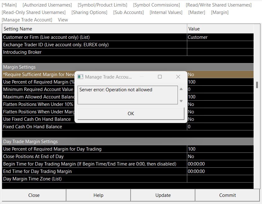 I have set up my live account with Edge Clear / Ironbeam. I am looking to adjust my account margin settings on the MAIN tab and I am receiving an error. When I try to adjust the settings, when I hit the submit button a receive an error (Server error: operation not allowed) and I cannot save any changes. I am looking to have my margin settings use Day trading margins vs. overnight maintenance margins. Thank you for your help on this error.