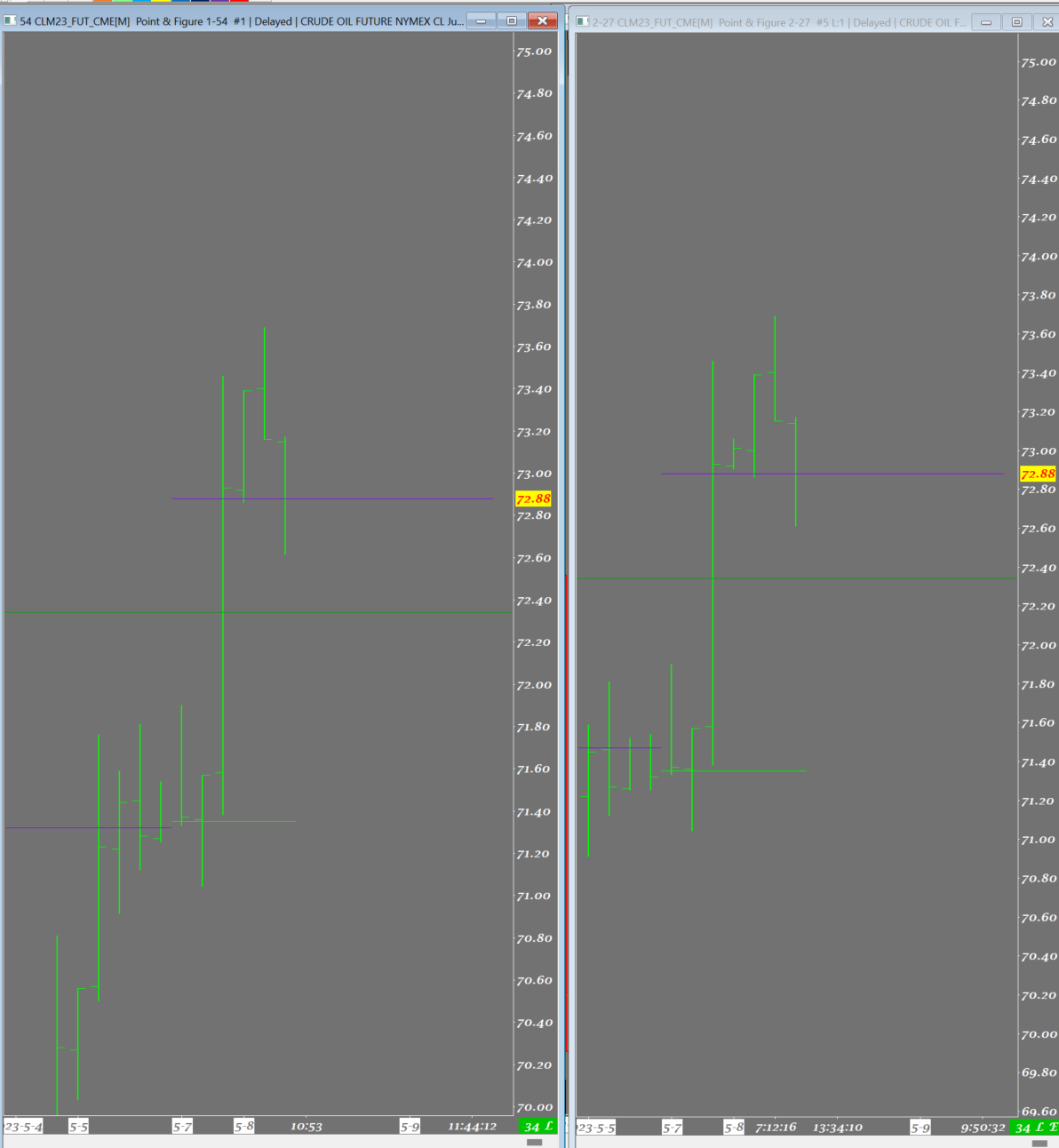 Thanks User431178, Your are right about the bars. There is a curtain way to select a start and end point for a volume profile that V-Zones teaches. What I'm seeing is different bars when using the 54 tick PnF vs the 2-27 PnF. Look at the attached screen shot taken only a few minute ago. 54 tick PnF on the left and the 2-27 PnF on the right. Why is there an extra bar in the 2-27 chart. BTW the way 54 tick PnF is 2-27 PnF. 27x2=54 Thanks Date Time Of Last Edit: 2023-05-08 15:48:53