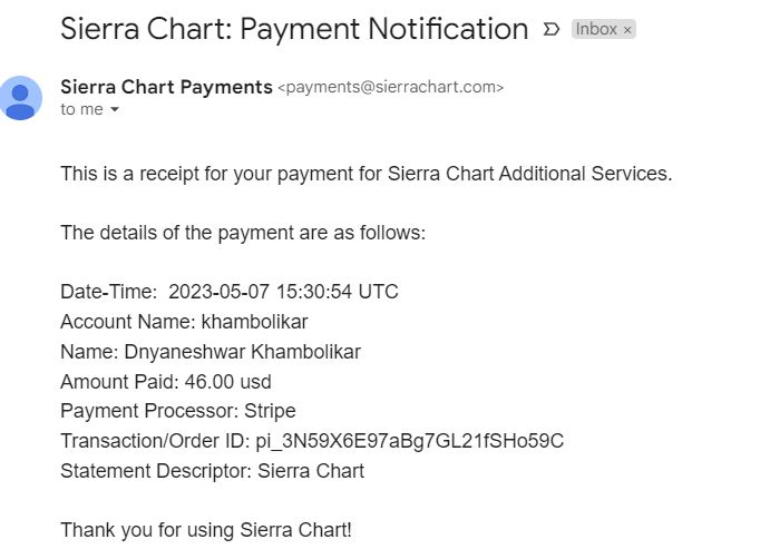 Dear sir/madam, Yesterday I activated Denali Exchange Data Feed CME / CBOT / NYMEX / COMEX Exchanges (package 11) attached snapshot for your reference. please activate my account details Date-Time: 2023-05-07 15:30:54 UTC Account Name: khambolikar Name: Dnyaneshwar Khambolikar Amount Paid: 46.00 usd Payment Processor: Stripe Transaction/Order ID: pi_3N59X6E97aBg7GL21fSHo59C Statement Descriptor: Sierra Chart Thanking you Khambolikar |