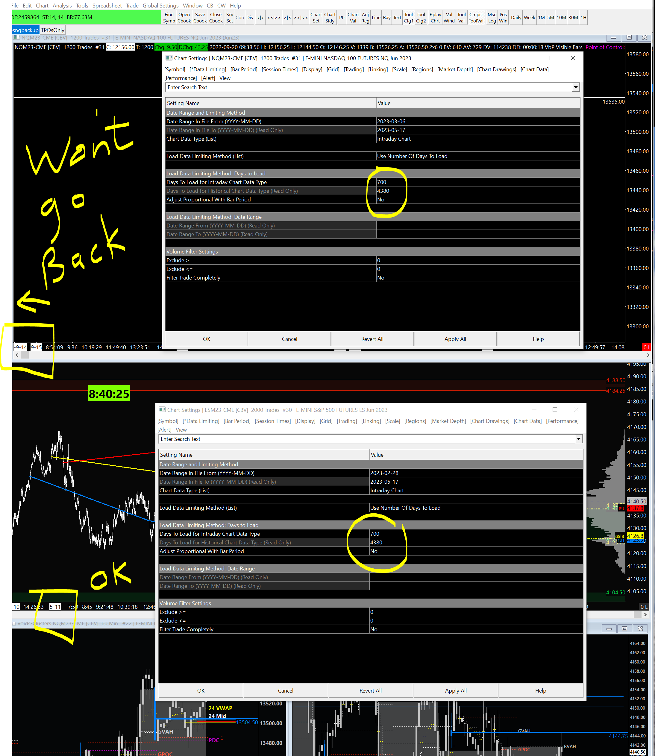 Hi John, I can't get NQ to load more than to last sept. You see both have the exact same settings. ES is fine. I have gone over every chart settings tab and both match, but nq won't load. Help please John! karen |