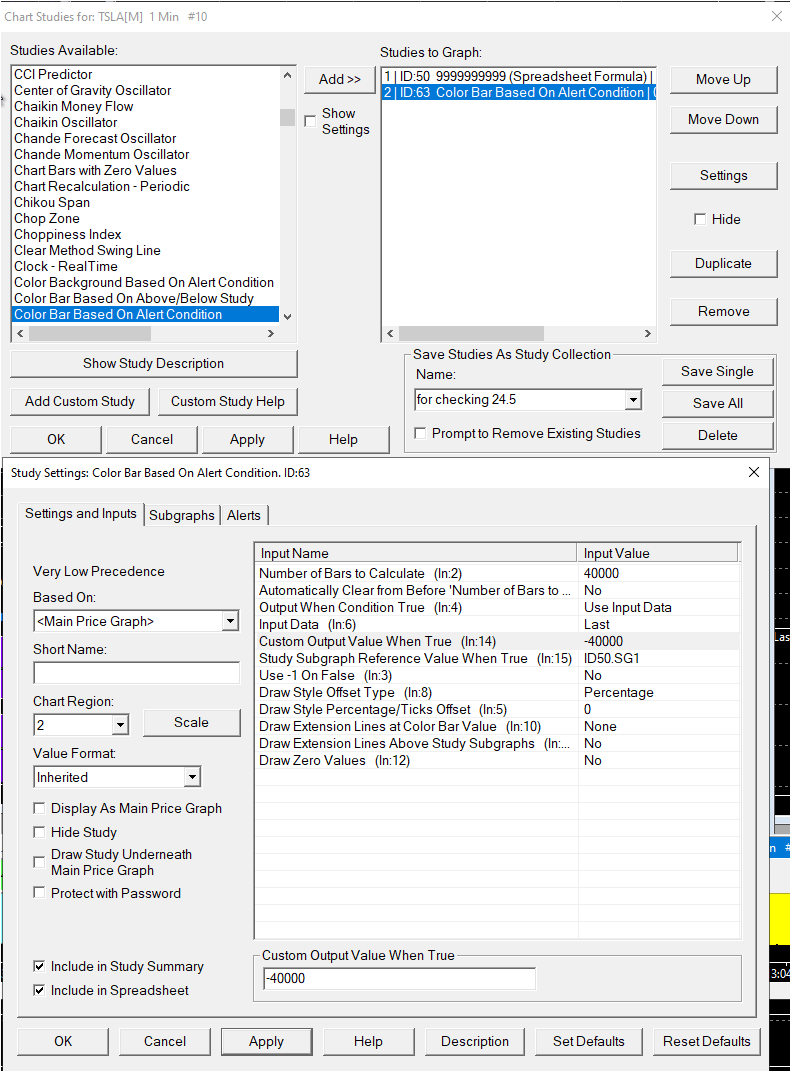 Here is the Study Collection updated to work for what you want. Note that you did not have any Alert Condition set in the "Color Bar Based on Alert Condition" and you needed to set the "Color Bar Based on Alert Condition" to be "Based On" the Spreadsheet Formula, and then set the Input Data, and the Output When Condition True to the Input Data. For the most reliable, advanced, and zero cost futures order routing, use the Teton service: Sierra Chart Teton Futures Order Routing |