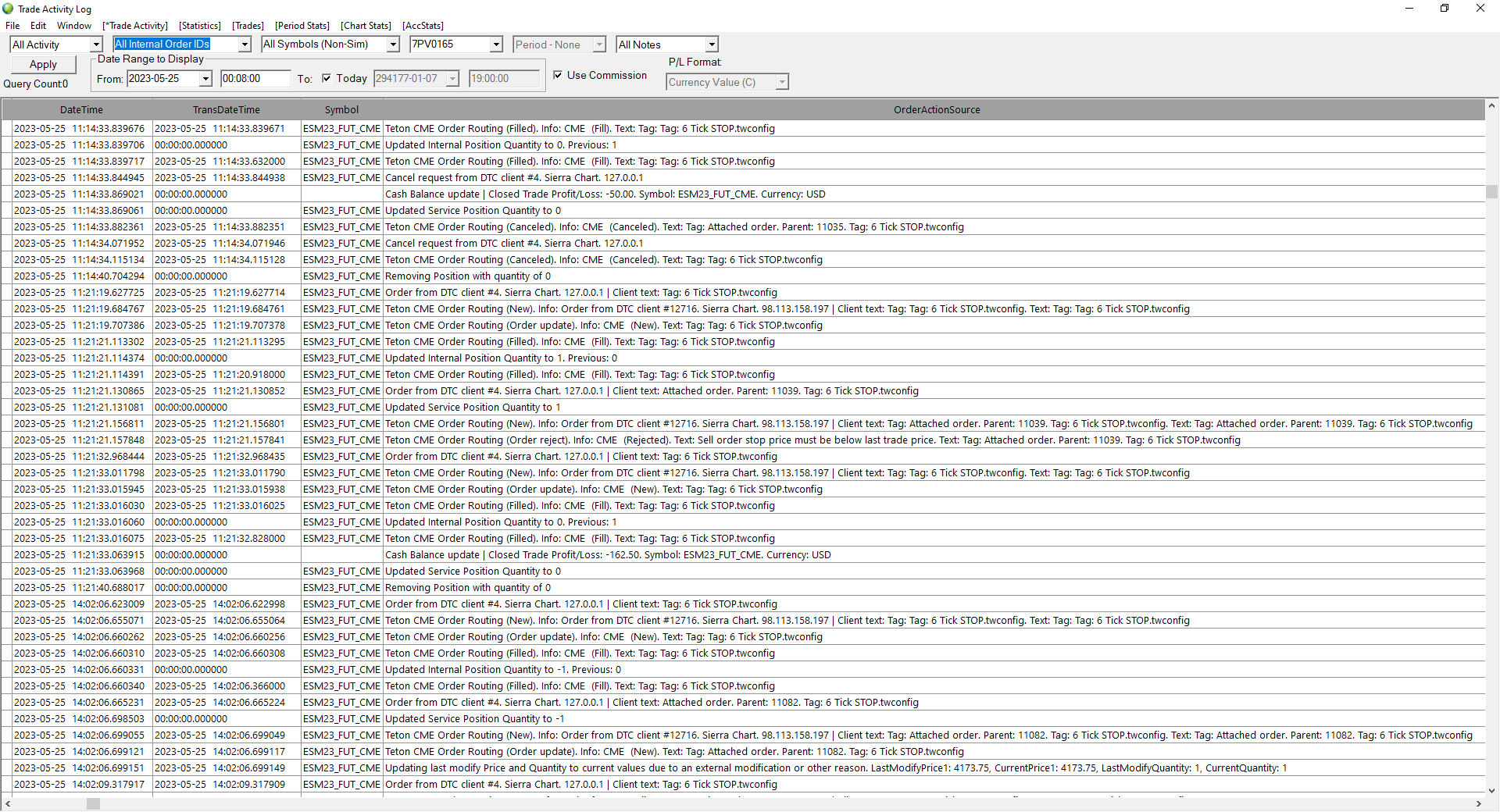 1. Given that the rejection is that the "Sell stop price must be below last trade price", then the most likely scenario is what is in post #3. 2. Your "From" date is set to the 25th. You would need to adjust this date and then select the "Apply" button. 3. Yes - refer to the information in the link in post #3. For the most reliable, advanced, and zero cost futures order routing, use the Teton service: Sierra Chart Teton Futures Order Routing |