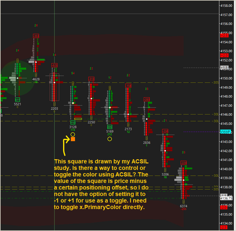 I have a custom ACSIL study which draws (among other things) a square 8 ticks below price. Thus, the output of the subgraph for this study is the bar low price less an 8 tick offset (or 0). Thus, the output cannot be a toggle (-1, 0, +1). What I want to do is toggle the color of this square independent of subgraph output (since it will remain "low price - 8 ticks" for positioning of the square when "true"). Is there a way through ACSIL to modify the color of the subgraph item, on a bar by bar basis? Again, while still outputting price (or 0). Please see attached example for clarification. Date Time Of Last Edit: 2023-05-28 15:24:54
