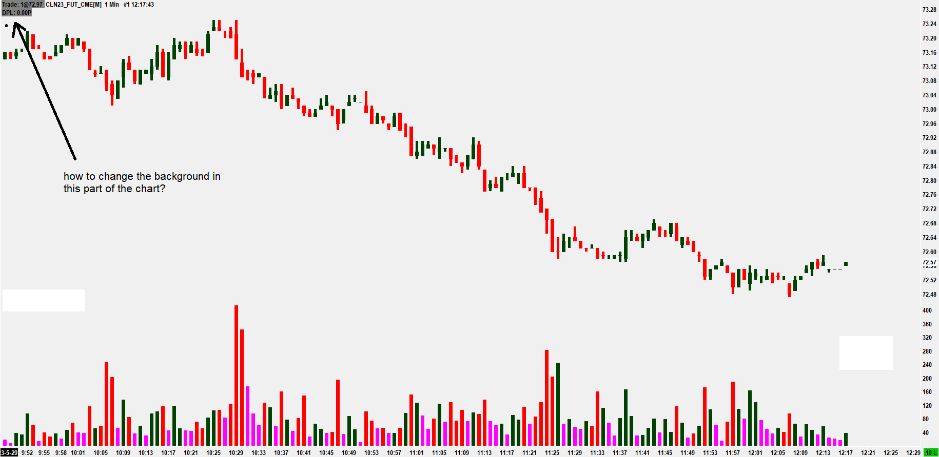 Hello. How to change the background in the selected part of the chart (top left corner of trade 1@...) to black so that it is not visible how many contracts I open in one trade? Thank you in advance for your answer. |