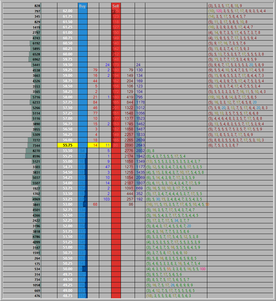 Follow up questions 1) Why are the MBO's that are seen not accounted for in the DOM/Market Depth resting order ? If you add up all the MBO's at times they are far greater than the Depth of Market (Bids or ask) 2) Why dont all the MBO orders get filled. Do they get suddenly pulled ? 3) Is there a way to somehow highlight/filter orders while still being able to see all the orders ? For example leave setting at 3 and then highlight (different color or font orders larger than 100) ? Thank you SPL |