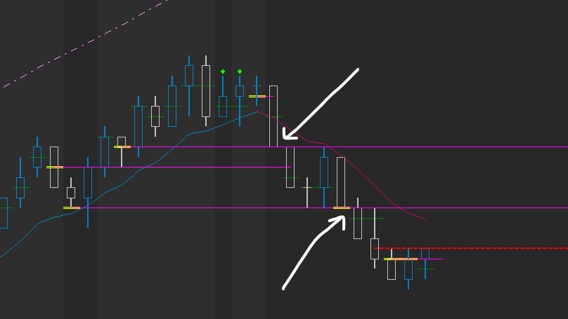 Apologies if this has already been covered in a post and I have missed it. When using the 'Extend to Future Bar Close Crossing' option, I have some issues when a bar closes at the same price as an extended line, then the next bar opens at the same price (or gaps a tick lower) then closes lower - however the line is still extended because a bar has never crossed and closed underneath. Attached is a screenshot that shows this, marked by the white arrows. You can see the extension in the middle of these two stops because the bar crossed. I understand that the name of this is 'bar crossing' so, technically this is working correctly, but is there a way that either a new option could be added, or this could be fixed so it accounts for gaps / bars closing and opening at the same price as the level? Thank you. |