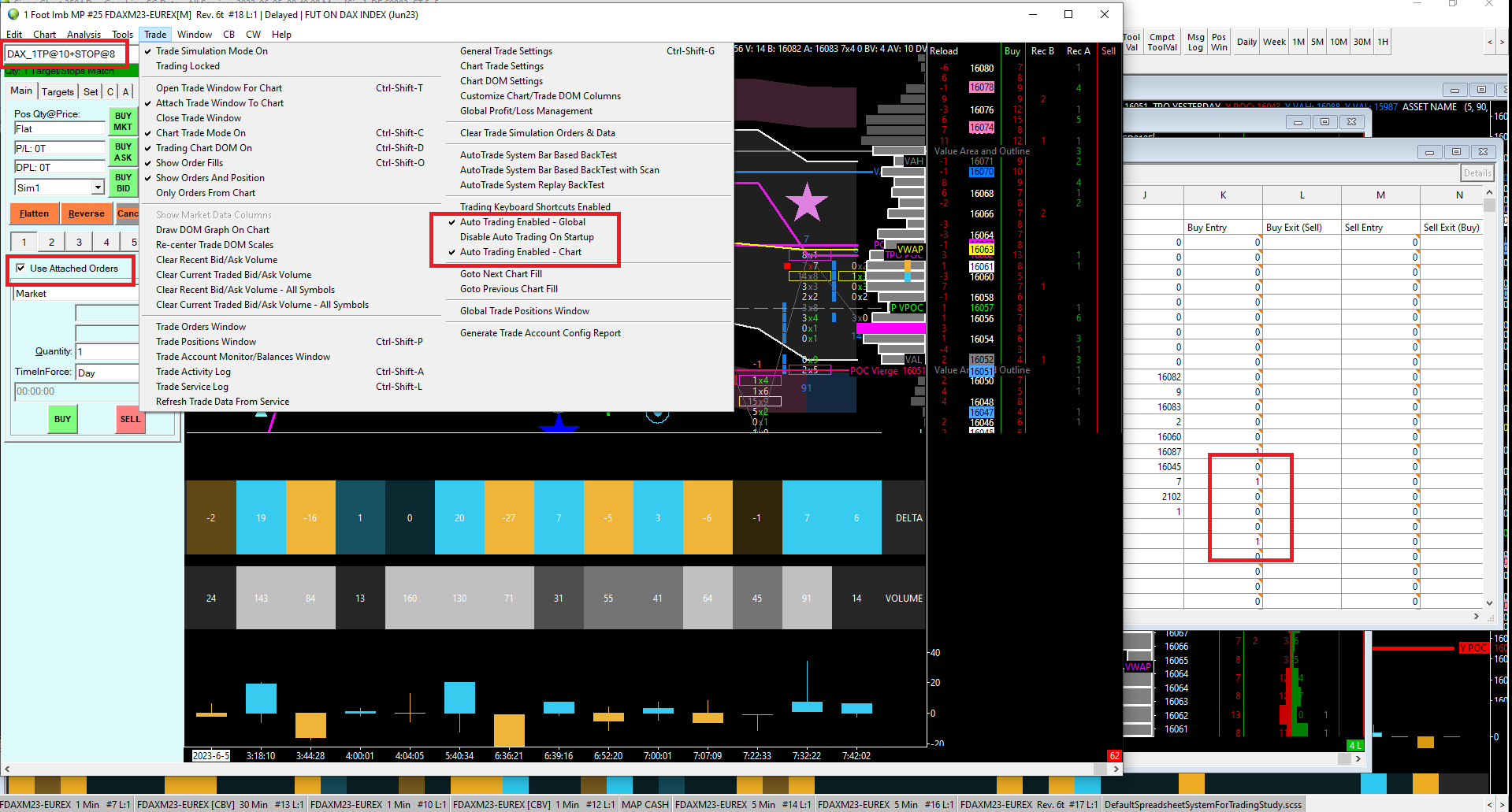 Keep in mind that in any situation (including replays), the order is only going to be entered for the current bar. What you show in your image are values of 1 for previous bars. So those are situations where an order could have occurred, but if the spreadsheet system was not running at that time, then that would not generate a live order (again, only on the current bar will an actual order be sent to the trading service (or simulated)). If the issue is that you are not getting those same results during a replay, then you would need to look at the type of replay (or backtesting) you are running. Refer to the following: Auto Trade System Back Testing: Differences Between Back Testing and Real-Time Auto Trade System Evaluation There are other items on the page above that might be helpful as well, so take a look. For the most reliable, advanced, and zero cost futures order routing, use the Teton service: Sierra Chart Teton Futures Order Routing |