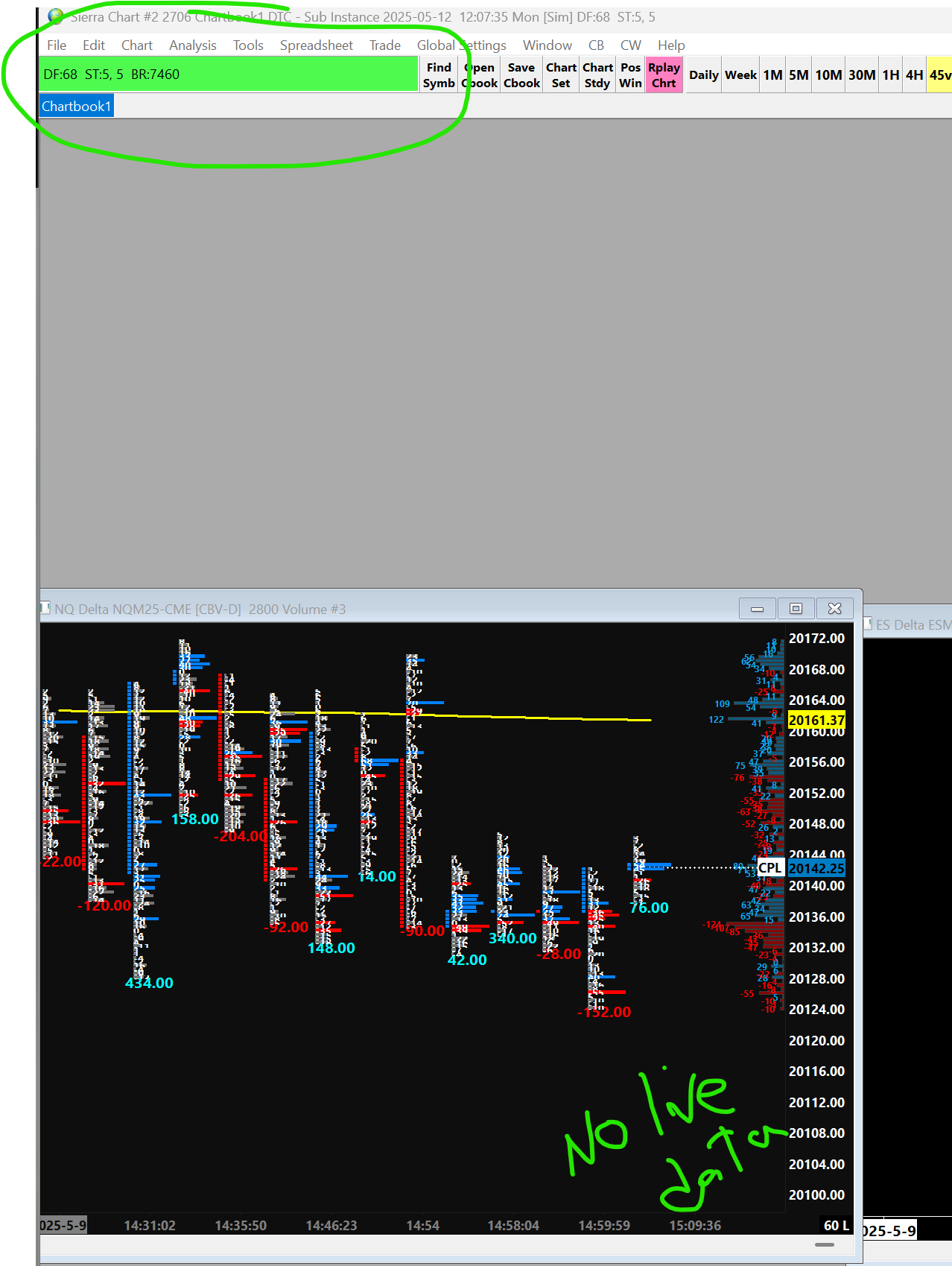 The answer is yes regarding post #5. We do not see any problem in the log. Therefore, refer to help topic 3: Intraday Chart or Chart Bars Not Updating | Blank Intraday Chart | "Currently no data to display" message for Intraday Chart Sierra Chart Support - Engineering Level Your definitive source for support. Other responses are from users. Try to keep your questions brief and to the point. Be aware of support policy: https://www.sierrachart.com/index.php?l=PostingInformation.php#GeneralInformation For the most reliable, advanced, and zero cost futures order routing, use the Teton service: Sierra Chart Teton Futures Order Routing |