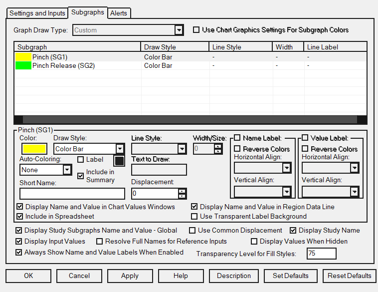 I have a custom coded study (not by myself) that changes the color of candles when the conditions within study are met. This is achieved through "Draw Style: Color Bar" in the "Subgraphs" tab. What formula can I use in the "Alerts" tab so that Sierra plays a sound when the conditions for study are achieved? I've attached pictures of the study settings. |