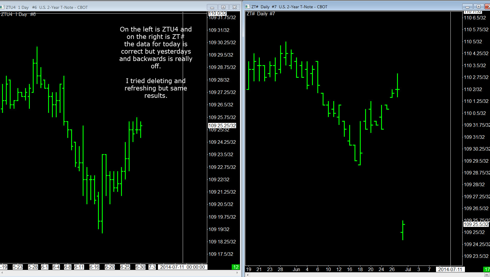 I figured out why ZTU4 and ZT# are different. On ZT# it looks like when they switch over from the ZTM4 to ZTU4 contracts it causes a gap (ZT# switches over at the end of the month vs ZTU4 switches over much sooner). Thanks. IG Date Time Of Last Edit: 2014-06-30 23:17:25