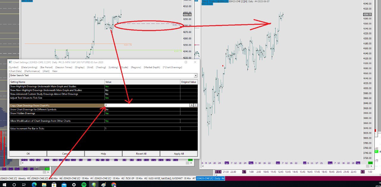Good morning there, can you help me please, I have a problem with my SC, I am trying to see ,the draw in another chart, but It is imposible, I dont know why. I AM GOING TO SEND A PICTURE FOR YOU ALL AND CAN UNDERSTAND ME, What I want is for a line that I paint on the chart to be displayed on the other chart, I have entered the functions but it is impossible. |