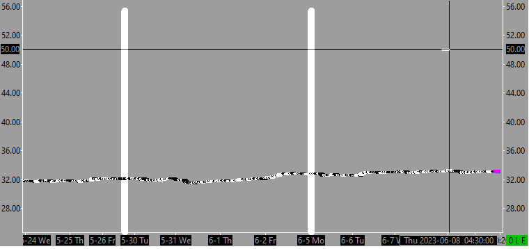 This is erroneous data transmitted by the exchange. We are working on filtering this out. This should be done by 12 PM US Eastern time 2023-06-9. At that time re-download the data: Data Errors or Spikes in Charts, Flat or Flat Line Graph, Compressed Graph, Errors with Date/Time Values: 2.1.2 Deleting and Re-downloading Data. (Easier and Recommended Method) Sierra Chart Support - Engineering Level Your definitive source for support. Other responses are from users. Try to keep your questions brief and to the point. Be aware of support policy: https://www.sierrachart.com/index.php?l=PostingInformation.php#GeneralInformation For the most reliable, advanced, and zero cost futures order routing, use the Teton service: Sierra Chart Teton Futures Order Routing Date Time Of Last Edit: 2023-06-09 08:49:35