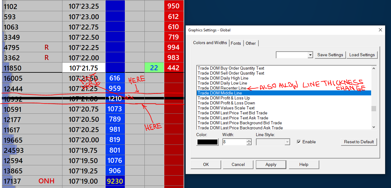 This is in the latest release. Update with Help >>Download Prerelease: Software Download: Fast Update In Global Settings >> Graphics Settings it is called Chart/Trade DOM Middle Line Sierra Chart Support - Engineering Level Your definitive source for support. Other responses are from users. Try to keep your questions brief and to the point. Be aware of support policy: https://www.sierrachart.com/index.php?l=PostingInformation.php#GeneralInformation For the most reliable, advanced, and zero cost futures order routing, use the Teton service: Sierra Chart Teton Futures Order Routing |