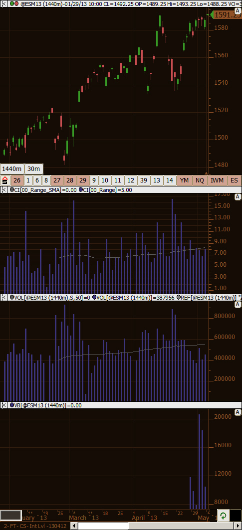 Hi; I have a thing I do where I compare the Range and Volume of pieces of the trading day. In other software I have used Sessions to do this. So for example I setup a Session that is just the first 30 min of the RTH Session then I get one bar per day and I can compare the Range and Volume today to an average. Also, other charting software has supported assigning buttons to set the chart to a particular session. This is important so that I can quickly switch between looking at the first 30 min to looking at the first 60 mins, etc. How would I do this in SierraChart where it allows only two sessions? I have attached a screen shot of the current chart I use. The buttons are for different sessions, the second pane shows me the Range, the third pane is the total volume for the "session" and the bottom pane is filtered to show the volume of trades larger than 150 contracts. This is another important feature, how would I do this in SierraChart? Thanks for your help |