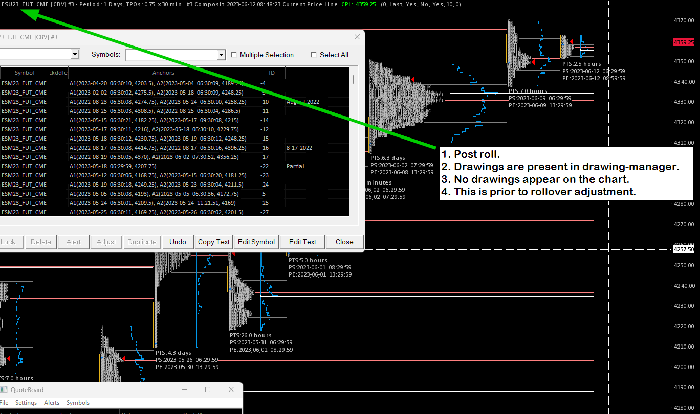 When rolling futures contracts the chart appears to lose the drawings. This is not a case of the drawings being in the wrong place but completely missing. The chart has no drawings after the roll. The drawings are still present in the "chart drawing manager", however they do not appear on the chart after the roll, before or after the "rollover adjustment" is made. I can roll back and the drawings reappear. Please let me know what is needed to correct this issue. |