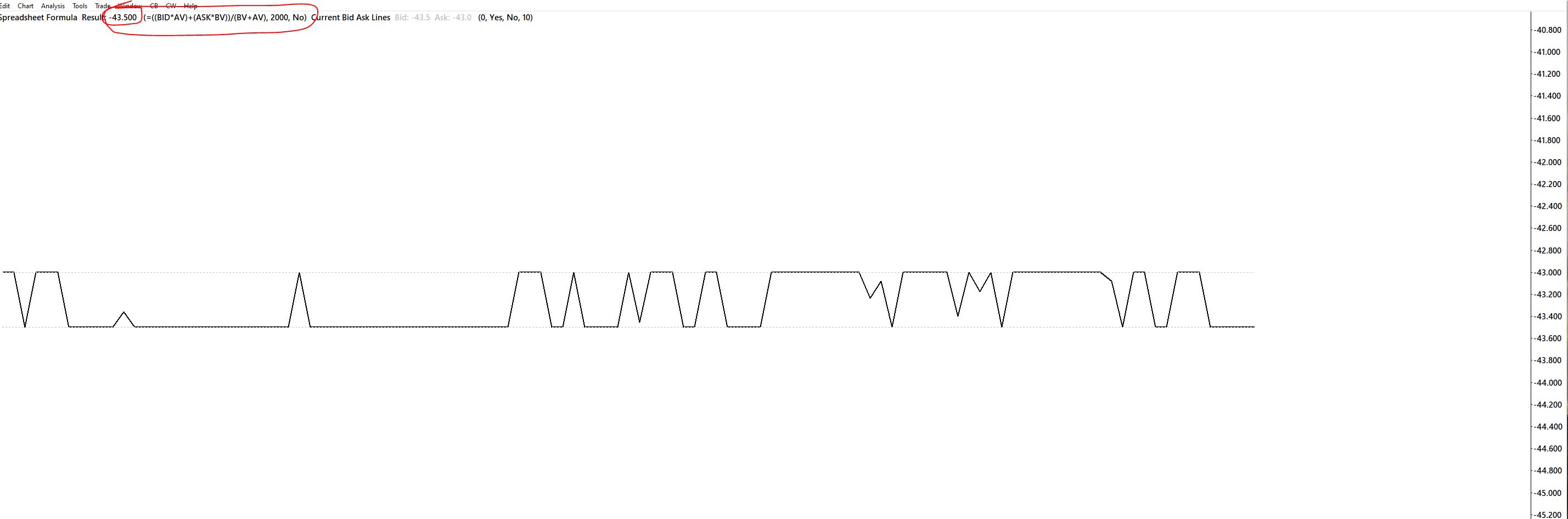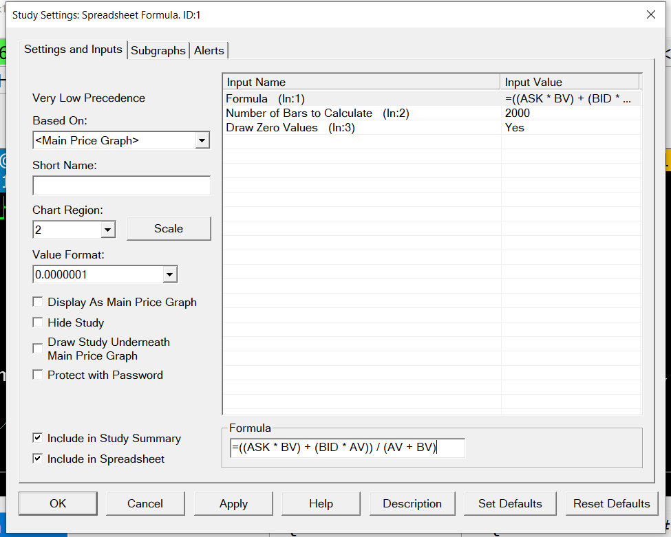 The suggestion we have is to take the formula piece by piece. Make sure you get the correct Price for Ask and Bid by using them by themselves. Then add each item piece by piece and see what happens. The other option would be to use the Spreadsheet Study. You would have to add other studies to get the Ask Price, Bid Price, Ask Volume and Bid Volume. Then use those to make the calculation in the Spreadsheet Study. For the most reliable, advanced, and zero cost futures order routing, use the Teton service: Sierra Chart Teton Futures Order Routing |