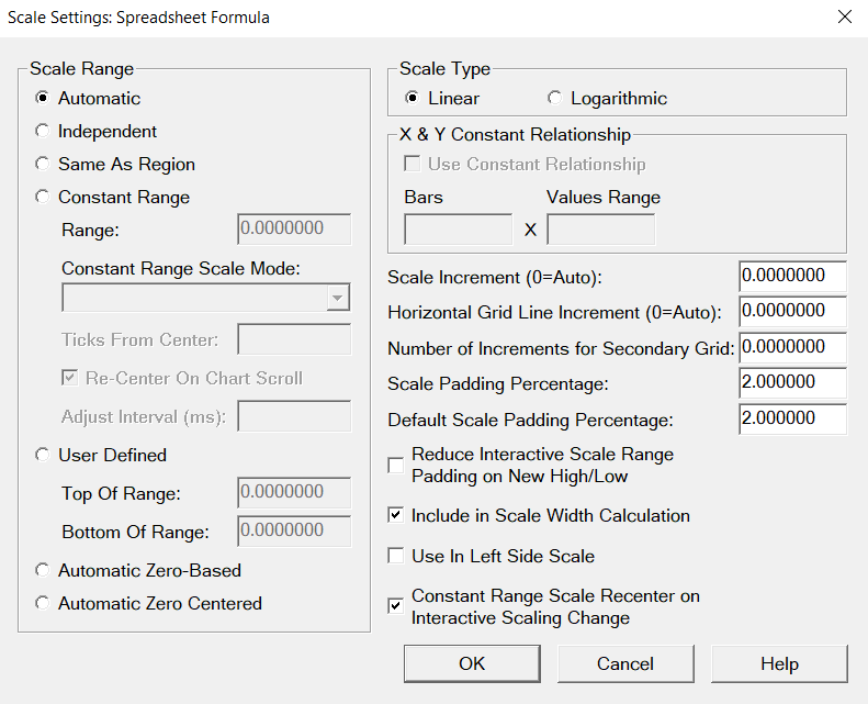Attached are the Spreadsheet Formula Inputs and the Scale Settings. Nothing special about either one. But, we did notice one thing, when there was no data coming into the system, the Spreadsheet Formula was not updating properly (so from 16:00 - 17:00 Central US time when the ES is not trading). At that time, we saw only a single value, but once it was after 17:00 everything updated properly. We do not know how this would relate to what you are seeing, but wanted to pass it along in case there is some relevancy. For the most reliable, advanced, and zero cost futures order routing, use the Teton service: Sierra Chart Teton Futures Order Routing |