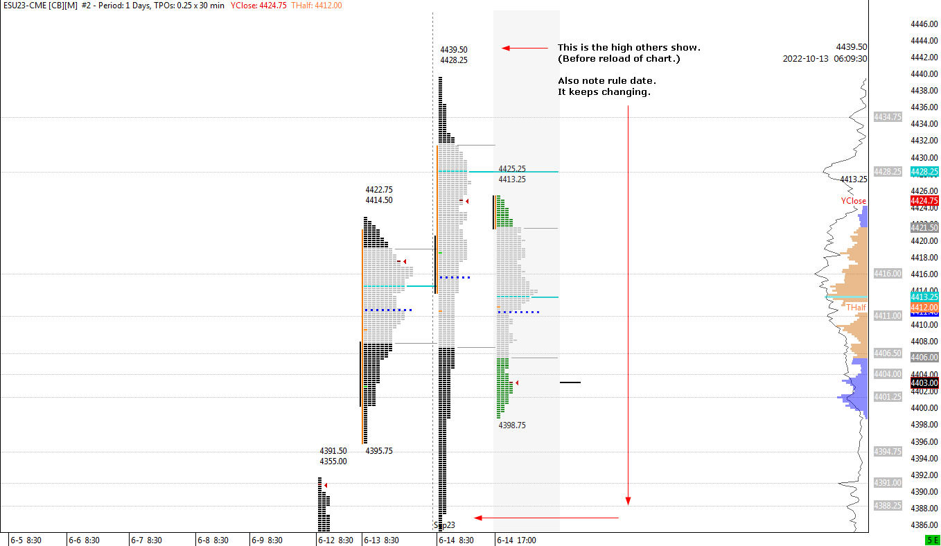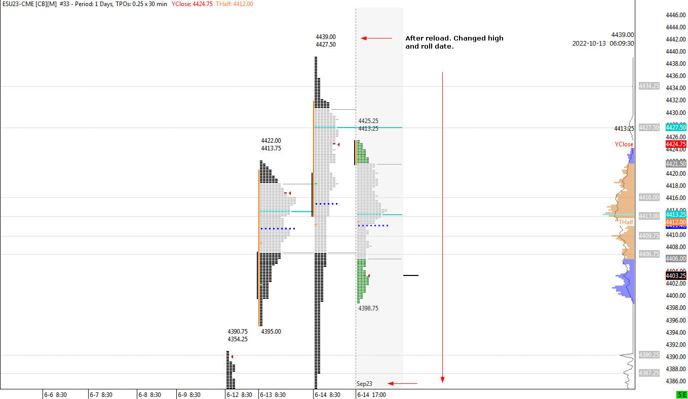 Thanks But it keeps adjusting the days before. Now it shows yesterday as the wrong high. It is showing 4439.00 now for yesterdays high. It was actually 4439.50. There was a 44 point difference between M and U for settlement after Friday. That is why I rolled on Sunday. When am I suppose to roll now? PS How/when do I fix yesterday and before. As I said the high was 4439.50 not 4439 as it shows now? |