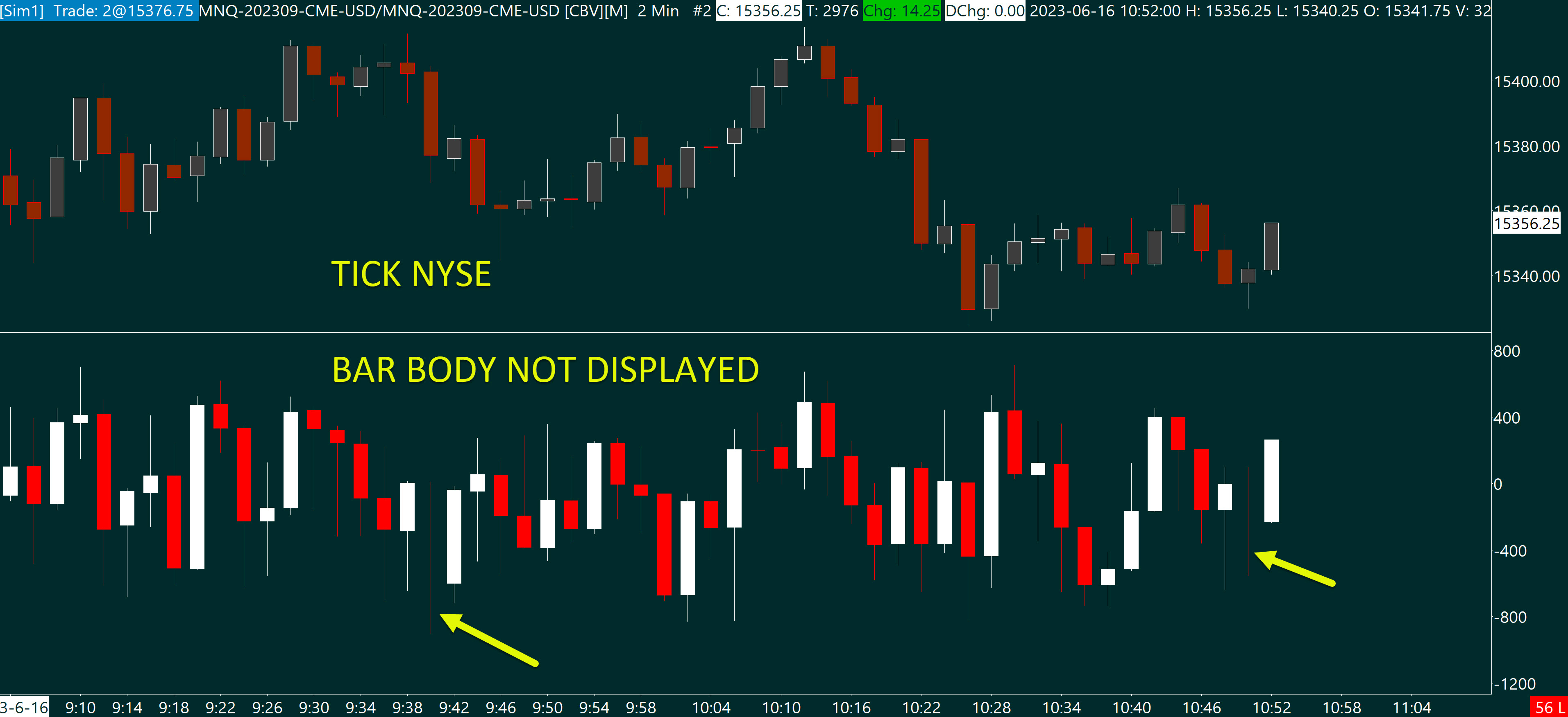 Can you please check, seems there is an error displaying bar body. The bar body is not displayed for two bars - showed on the attached file. Data feed Denali, TICK NYSE 2023.06.16, 2 minute bars: 9:40 and 10:50 |
