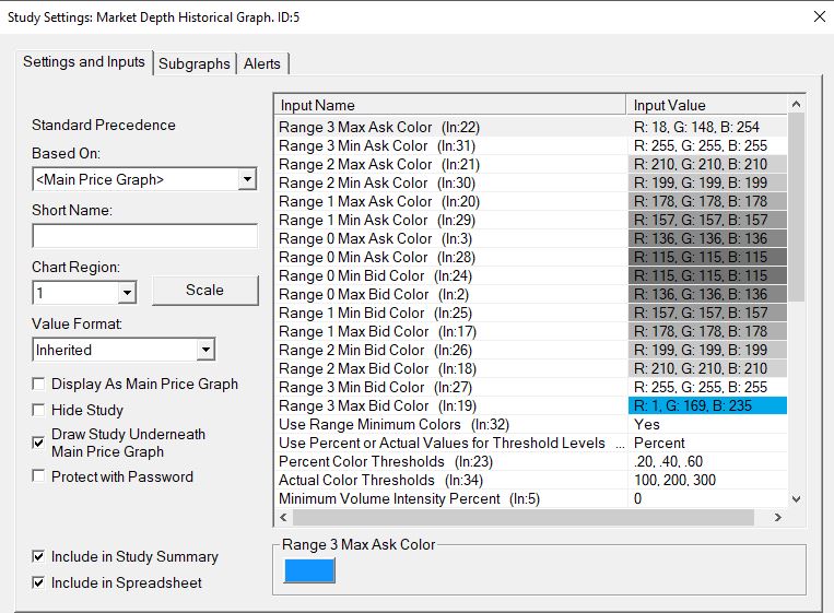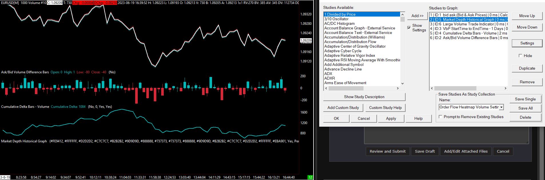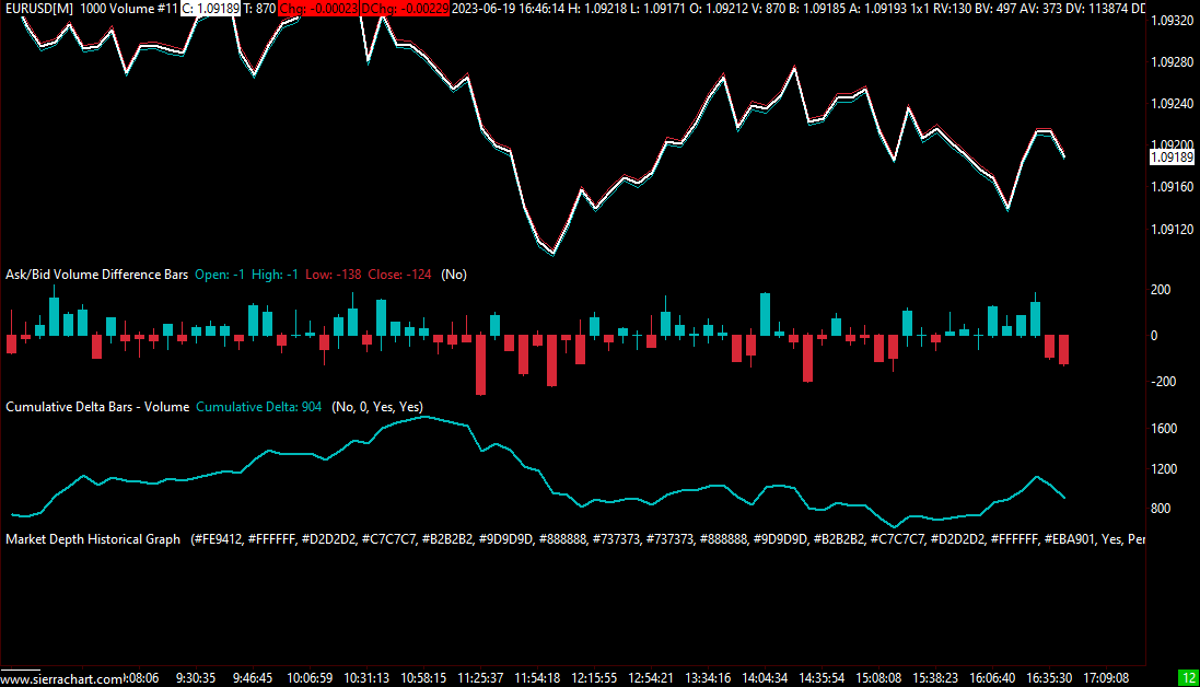 The Market Depth Historical Graph will not work properly at all with EURUSD. You need to use it, with futures, or NASDAQ TotalView data. Also it must be displayed in Chart Region 1. It is displayed at the bottom of the chart in a different Chart Region. It will not work there. Sierra Chart Support - Engineering Level Your definitive source for support. Other responses are from users. Try to keep your questions brief and to the point. Be aware of support policy: https://www.sierrachart.com/index.php?l=PostingInformation.php#GeneralInformation For the most reliable, advanced, and zero cost futures order routing, use the Teton service: Sierra Chart Teton Futures Order Routing |