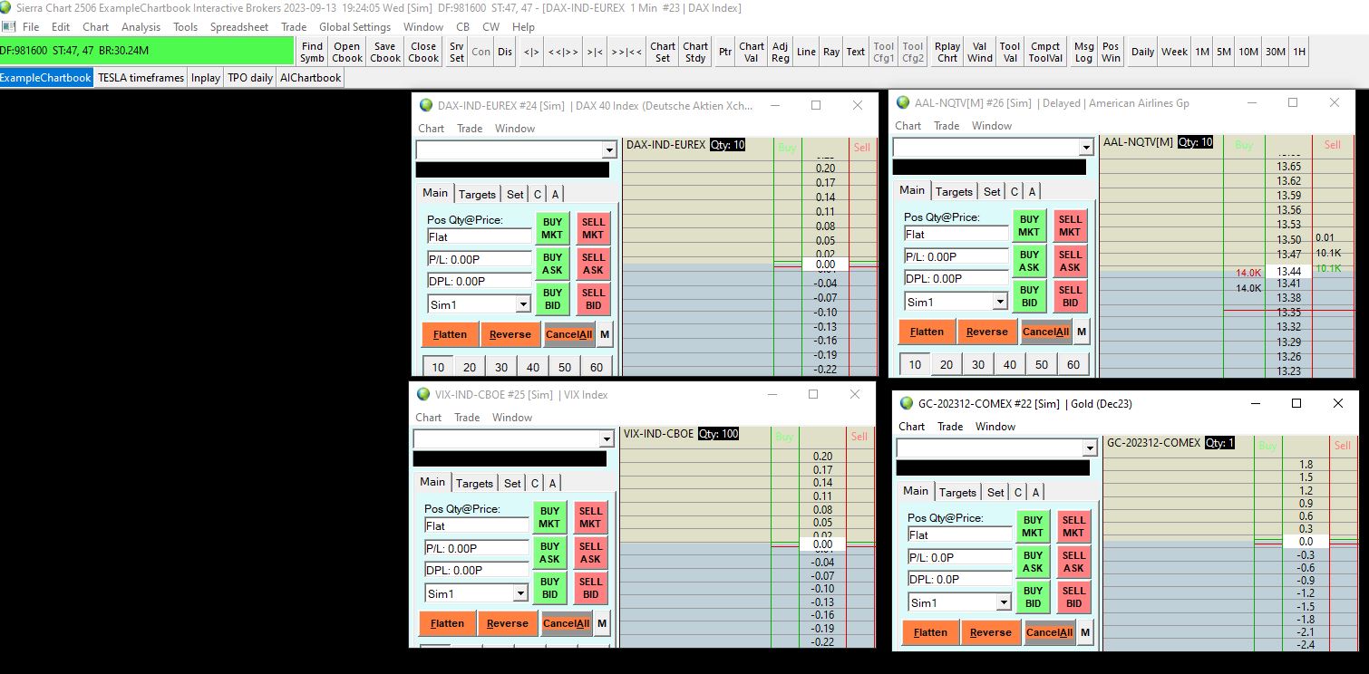 Our apologies, we thought you had the "NASDAQ TotalView" exchange active. The reason you are not getting any market depth data is because you do NOT have it activated. Without paying for it, you will not get the Market Depth data, even with the delayed data. We do see that you have the "U.S. Equities Consolidated Tape" exchange active. Therefore, if you want to be able to get the bar data and volumes from the U.S. Equities Consolidated Tape along with the Market Depth from the NASDAQ TotalView, then you need to activate the "NASDAQ TotalView" exchange. Then since you will have both the exchanges active, you can open a stock symbol using the suffix of "_MBO" and this will give you this information (for example - TSLA_MBO). You can activate the NASDAQ TotalView exchange at the following link: https://www.sierrachart.com/UserControlPanel.php?page=DenaliDataFeedNASDAQ#Exchanges -- With regards to Interactive Brokers, the main thing to keep in mind is that when using any of these specialized symbols (such as TSLA-NQTV or TSLA_MBO), that IB will not recognize these. Therefore, you need to use the "Trade and Current Quote Symbol" option and enter the symbol that IB needs to see in that field. In this case you would also want to set the option for "Use as Trade Only Symbol" to "Yes". You will find the information for these settings at the following link: Chart Settings: Trade and Current Quote Symbol (text box) (Chart >> Chart Settings >> Symbol >> Symbol menu) But, you also need to be aware that there are miscellaneous issues that can come up with IB. Refer to the following: Interactive Brokers Trading Service: Trading Related Issues For the most reliable, advanced, and zero cost futures order routing, use the Teton service: Sierra Chart Teton Futures Order Routing |