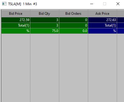 The symbol TSLA will not have any market depth data. That symbol says to use our U.S. Equities Consolidated Tape data. In order to view the Market Depth, you need to use the symbol TSLA-NQTV, which tells the system to get the data from our NASDAQ TotalView exchange. Refer to the information at the following link regarding this data: Denali Exchange Data Feed: Nasdaq TotalView Data Feed Notes Please open a chart for "TSLA-NQTV" (no quotes) and then open the Market Depth Window and see what is shown in there. -- We do not understand the symbols that you have for the DOMs that you show from the previous post. For instance the symbol "GC-202312-COMEX is an Interactive Brokers style symbol. And we have no idea about the other two. It is always best to open a chart using the "File >> Find Symbol" option to ensure you have the correct symbol. For the most reliable, advanced, and zero cost futures order routing, use the Teton service: Sierra Chart Teton Futures Order Routing |