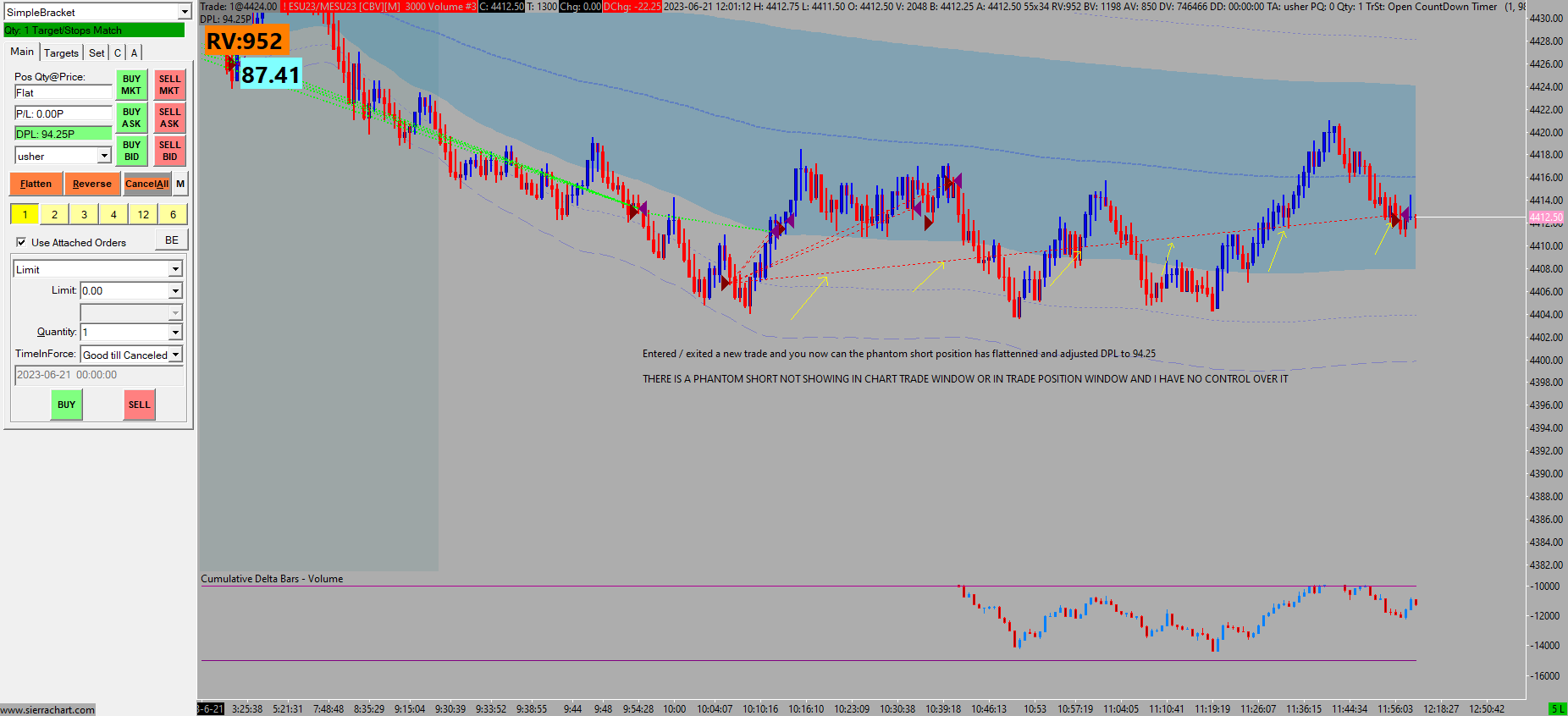 Please read carefully what i've written, and refer to the screen shots. My position is showing FLAT - nothing in Trade Position Window and FLAT on Chart Trade Window, as one would expect. HOWEVER, there is a constant phantom short position being held. Upon entering a new trade, the phantom short flattens and re-enters. This is shown in the screen shots I have already sent. I will action this AGAIN with the trade position window showing also - notice in SCREENSHOT 1: FLAT in trade window and FLAT in trade position window, and on chart. However behind the scenes there is a phantom short - now to SCREENSHOT 2: SCREENSHOT 2: Upon entering a trade, the phantom short flattens https://www.sierrachart.com/image.php?Image=1687363059172.png https://www.sierrachart.com/image.php?Image=168736327326.png |