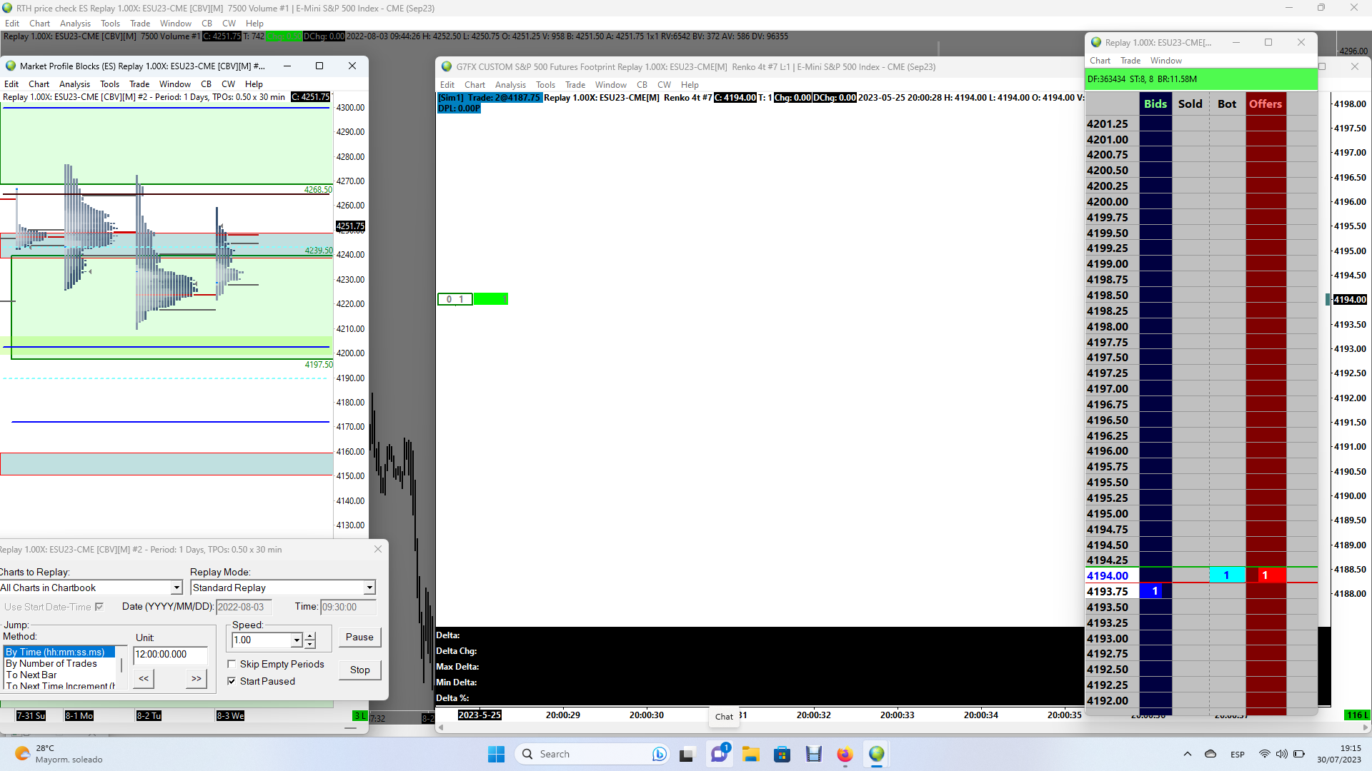 The DOM and footprint isn't worry in replay. Actually 2 of 7 charts are working. In real time everything work's I've read the documentation "replaying charts" and have made the session time and loading days the same for every chart. Skip empty periods is off. I've read in the support board about replay but couldn't find nothing there that solved the problem. Any help? |
