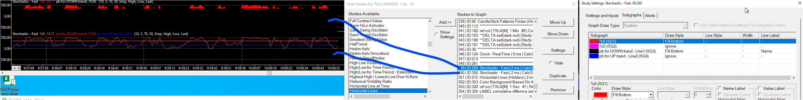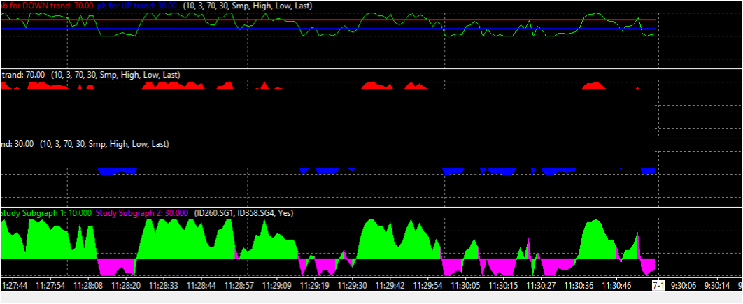 It was more difficult than I thought. You'll need to add two instances of the Spreadsheet Formula study: - One to create a %K overbought only line. - One to create a %K oversold only line. - Set the Chart Region to same as the Stochastic - Fast study, and Hide these studies. You'll need to add two instances of the Study Subgraphs Reference study: - One to fill from the overbought only line to the 70 line. - One to fill from the oversold only line to the 30 line. - Set the Chart Region to same as the Stochastic - Fast study. For an example of the formulas and references, open a blank chart and apply the attached Study Collection. |