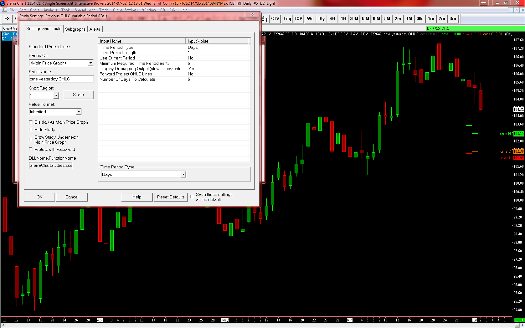 I am using SC Historical Data specifically (not sure if intra-day charts drawn in a daily / weekly format have this issue) but here is the problem. It will not plot yesterday's OHLC? Settings: Time Period Type: Days Time Period Length: 1 Use Current Period: No Min Required Time Period as %: 5 Display Debugging: Yes Forward Project OHLC Lines: No Number of Days to Calculate: 5 See attached screen capture (CL August futures daily chart). It plotted the OHLC of some random day? I guess my questions are as follows: 1. The faulty plot is plotting something a month ago - just eyeballing and not tested as yet. 2. If I plot the previous week OHLC on a daily chart, it seems to work. However, if I try to plot the previous week OHLC on a weekly chart, it will not work and same problem? So it appeared less likely that I am using it wrong and something wrong with the study? Please help. Date Time Of Last Edit: 2014-07-02 19:32:11