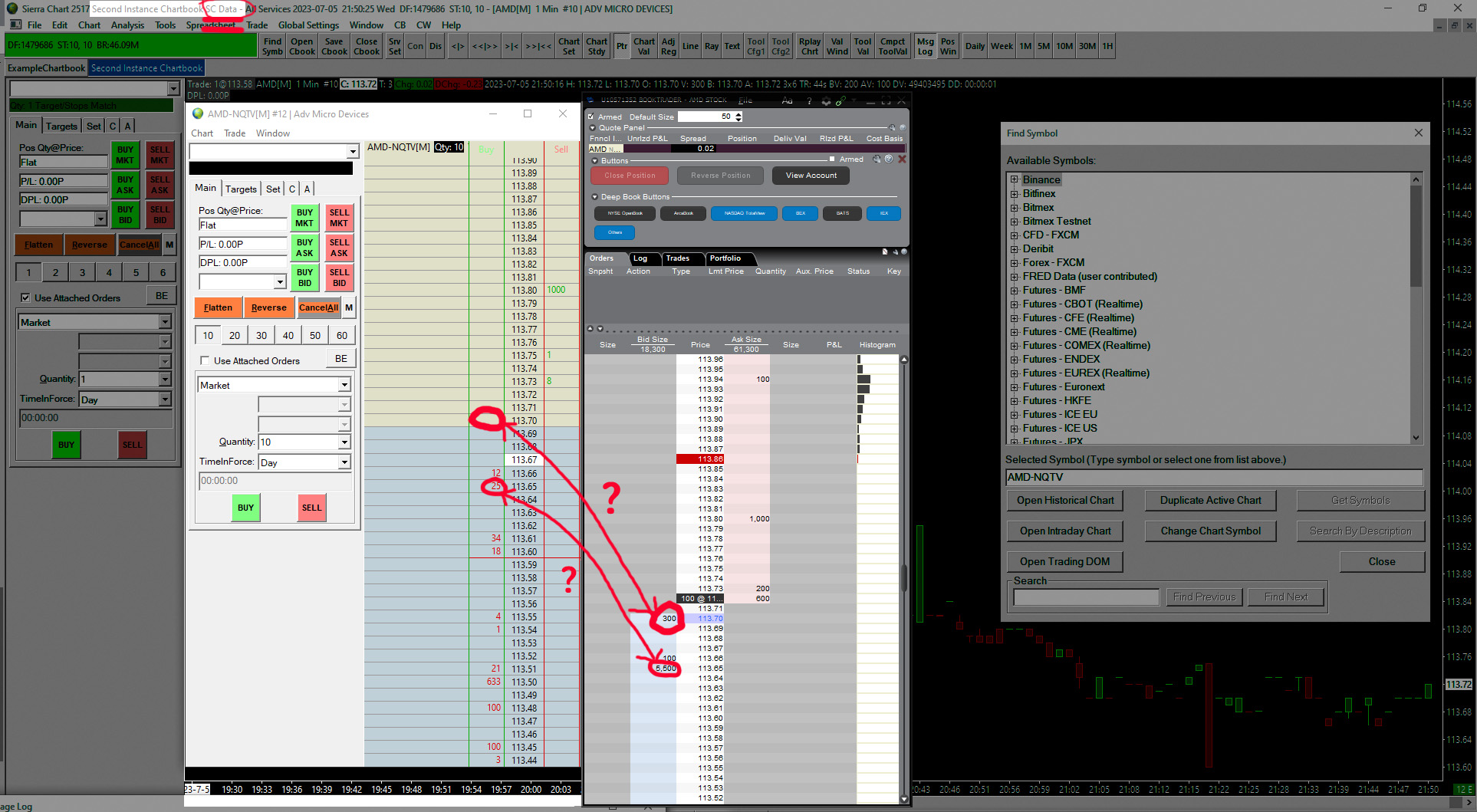 In response to post number 10, I have done what you wrote. I have installed a second Sierra Chart instance and set its data to SC Data-All Services. [M] is present on charts. Top of the book is shown. For level 2, I'm entering **-NQTV symbols but part of the bid/ask quantities are absent. Please view my first attached picture for an example: According to TWS, 300 bids exist at $113,70. Sierra Chart displays none at this price. According to TWS, 5500 bids exist at $113,65. Sierra Chart displays only 25. Besides, placing an order in the second instance of Sierra Chart automatically turns trade simulation mode on. Live trades still have to be taken in the first instance. ------ In response to post number 9, I was indeed using Interactive Brokers data in that video. Because the Denali feed doesn't yet consolidate NASDAQ TotalView and U.S. Equities into one, it is worse for me to use. My trade entry and exit decisions are determined by volume and how the current price compares to where other buyers/sellers are entering their orders. Thus, not seeing both simultaneously is a dealbreaker. It's either I'm viewing full volume by entering AAPL, or viewing level 2 data by entering AAPL-NQTV. I would need both at the same time. While I understand some other traders may not be bothered by this, my style of trading is off because of this. That is why I've persisted on using Interactive Brokers' data. The downside is a terribly jittery display of level 2 prices. Distinguishing "symbol" and "trade current symbol" ("use as trade symbol only" being set to yes) works fine for level 1 symbols such as AAPL. Level 2 symbols such as AAPL-NQTV miss some of the bid/ask quantities just like in the first example above. Please view the second attached picture. Would mixing data feeds with DTC server be a solution? |