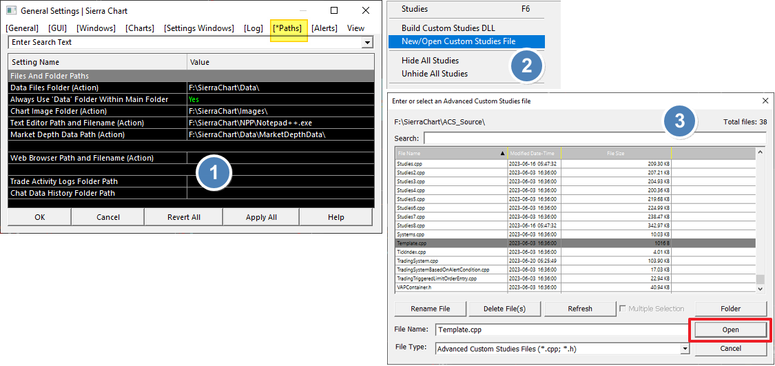 We are not fully understanding the particular problem. It sounds like you solved it by downloading the latest release from us. If you are still having an issue, then check the setting for the "Text Editor Path and Filename", which gives the location of where the editor is located to use when you select the Open button on that window. Refer to the following: General Settings Window: Text Editor Path and Filename (Global Settings >> General Settings >> Paths >> Files and Folder Paths) For the most reliable, advanced, and zero cost futures order routing, use the Teton service: Sierra Chart Teton Futures Order Routing |