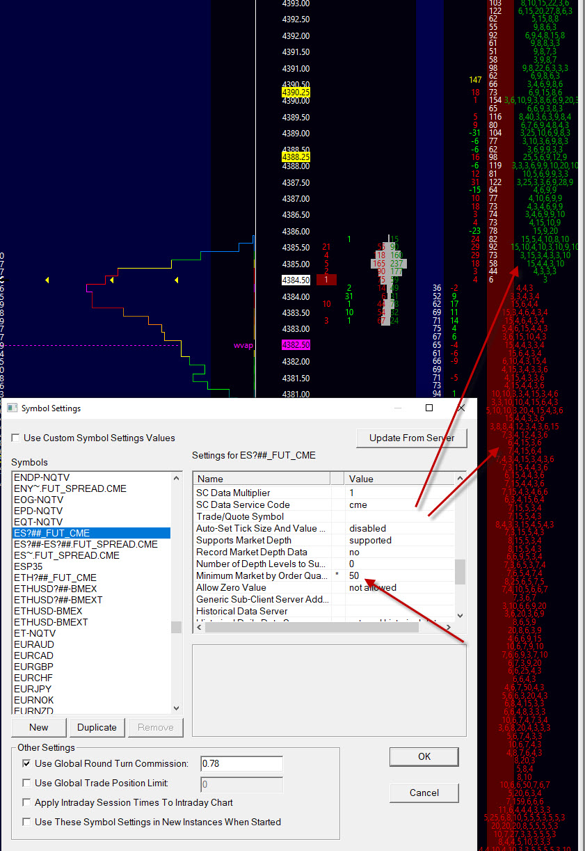 So restarting Sierrachart finally helped and it started. But I still have a problem. Why does MBO still show me all of them in the DOM and not just those above 50 when I set ES Minimum Market by Order to the value 50 in Symbol Settings? |