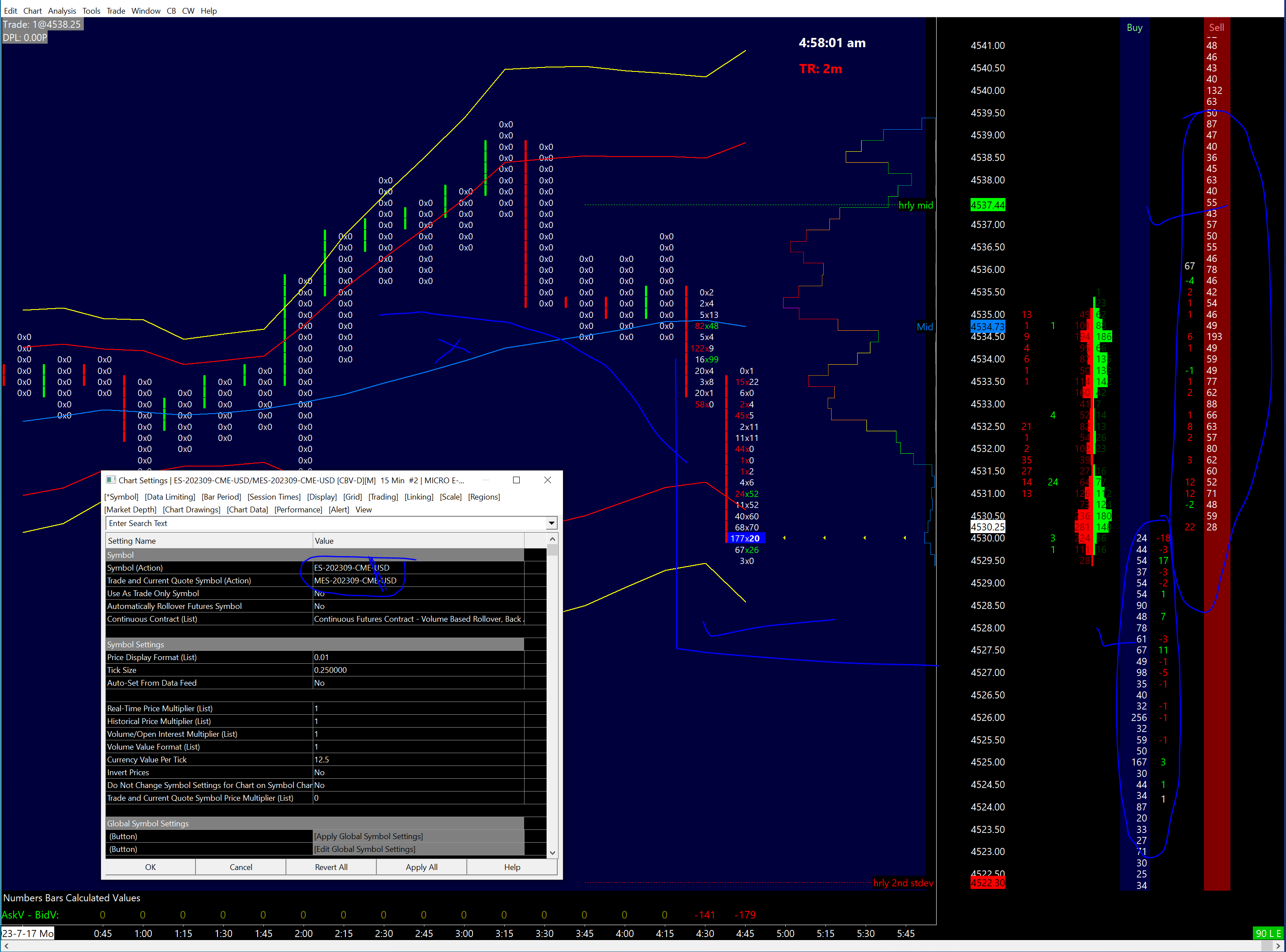 I have followed each and every item given in the link. Basically, its all default set to 0, I have not changed them anyways. Yes, for individual chart (MES) the market depth is complete, I also noticed that. But when I combine it i.e. Symbol (Action) : ES-202309-CME with Trade and Current Quote Symbol (Action): MES-202309-CME, then I dont receive complete market depth. I made a change to my symbol format, where I added option currency format i.e. ES-202309-CME-USD and MES-202309-CME-USD. I can see the market depth as per my expectations. But again here problem is that, historical data for Number charts went to 0*0 and at each reopening of the chart book 'Symbol setting not found for current service' message is received. But for number bars, from where I made the change data can be received. I am attaching an image for further reference. I dont know if this is ok to execute trades, when such message is displayed at opening of the chart/chartbook, I guess not. |