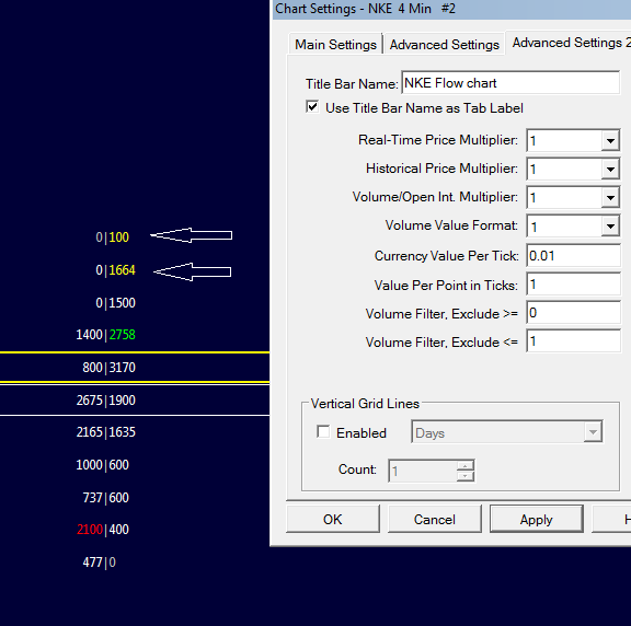 I'm talking about bid vs ask, however i'm referring to how it's calculated in the study. I don't want trades with a zero value on the bid or ask side, to be included in my diagonal comparison study. So in the image posted i don't want the top two trade prints(100 & 1664) to be highlighted, as it's giving a false sense of strength. eg Yellow is my top threshold which is set to 500, however if a 100 lot goes through and it's being compared to a zero lot on the other side, then that's hardly relevant, and gives no indication of strength. It just clutters my study. The volume filter just reduces the volume amount on each side, but will still color the prints if they remain x amount greater as per the threshold set. If in the same example below I adjust the bid/ask threshold to 1, then that would just hide the zero's from 'view', however i'll still end up with the 100 & 1664 left highlighted. |