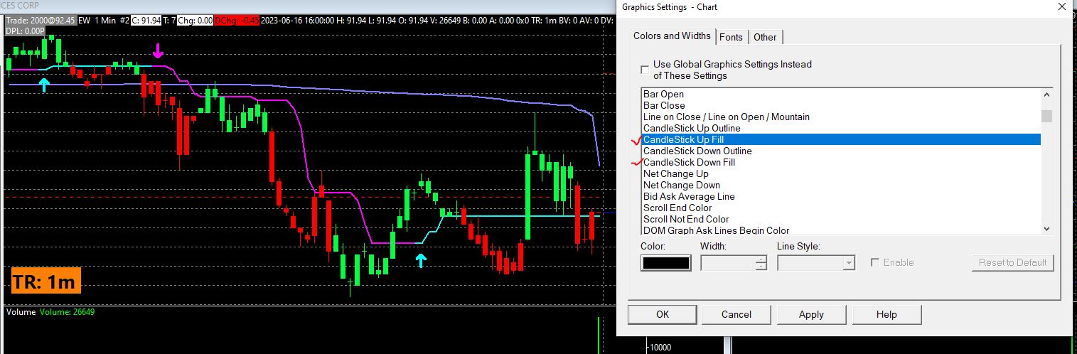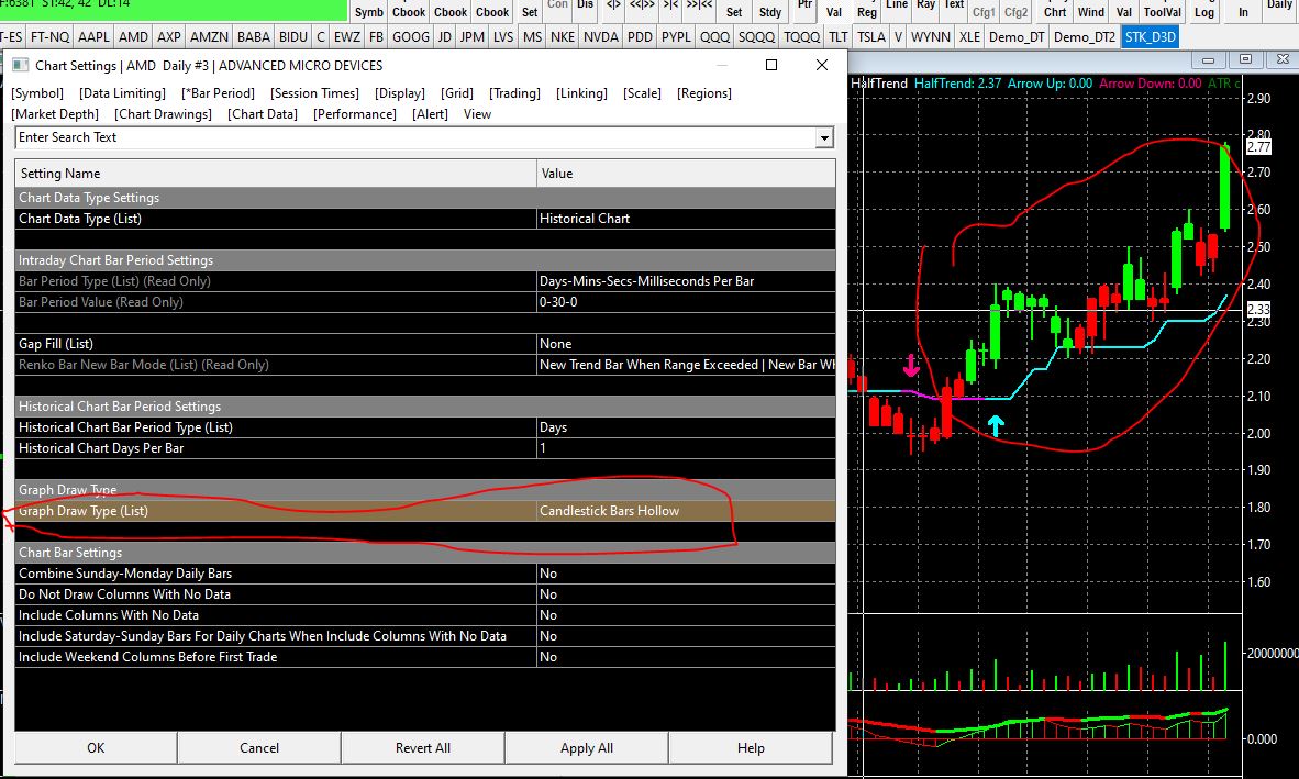With regards to the Candlestick Hollow, try selecting the option from within "Chart >> Chart Settings >> Bar Period >> Graph Draw Type". -----It does not work (pls refer to the attachment). Your bars are being colored by one of your studies (which is overriding the graph draw type), you can see that as there are bars that are clearly colored opposite to their direction. Check all you studies and set drawstyles accordingly. -----no matter using arrow or scroll bar, they both make the chart move many bars, Check that your scroll multiplier is set to 1 General Settings Window: Scroll Multiplier (Global Settings >> General Settings >> GUI >> Scroll) Global Settings -> General Settings -> GUI -> Scroll Multiplier |