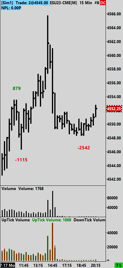 I have the Zig Zag Study set to Ask Bid Volume Difference and just showing the volume text above and below the price bars. Why isn't the most current swing populating with volume? I have the Reversal Amount set at 4 points, so even though price hasn't moved up 4 points( actually it did briefly), the volume should be populating somewhere, still on the downswing or on the current upswing. But it isn't populating at all. Also, what setting do I change to keep those volume numbers within the chart view? Notice the highest bar volume number is not in view. Date Time Of Last Edit: 2023-07-18 01:53:35
