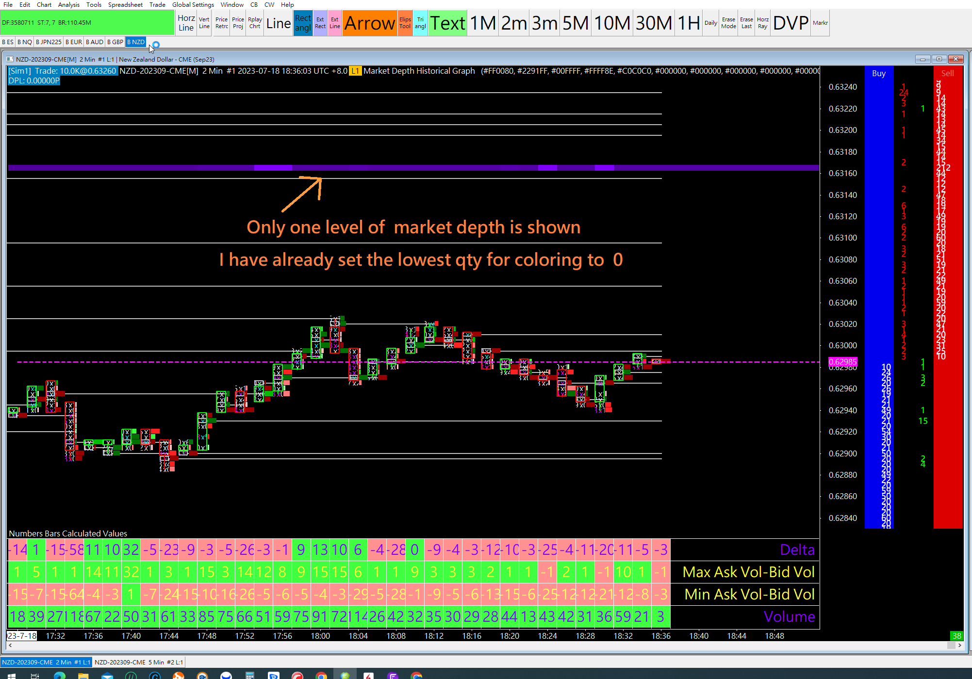 Hi, Enclosed please find two pictures. GBP and NZD futures. Please note that the two charts has THE SAME template and market depth history graph study setting . I have got the full level of market depth history graph in GBP but only got one level in NZD. Please advise how I can have the full levels in NZD ( same as GBP ). Thanks |