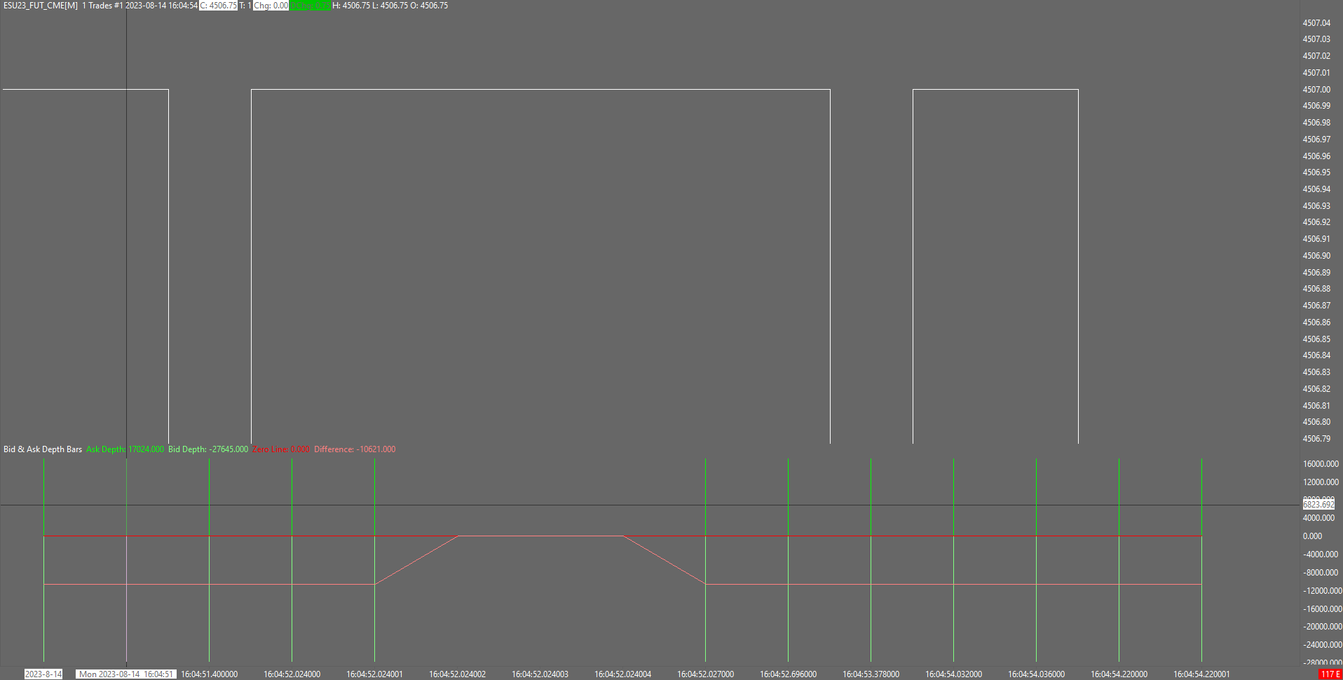 We have reviewed how the Bid Ask Depth Bars study functions. We want you to update to the latest prerelease. Set Chart >> Chart Settings >> Scale >> Include Microseconds on Intraday Chart Timescale, to Yes. Provide an image of the chart again that also shows the timescale and with enough space in between the bars so we can see each timestamp. Sierra Chart Support - Engineering Level Your definitive source for support. Other responses are from users. Try to keep your questions brief and to the point. Be aware of support policy: https://www.sierrachart.com/index.php?l=PostingInformation.php#GeneralInformation For the most reliable, advanced, and zero cost futures order routing, use the Teton service: Sierra Chart Teton Futures Order Routing |