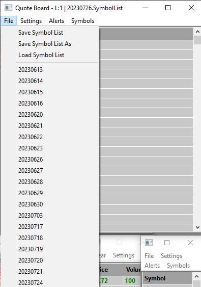 I save my list of symbols every day for trading as a historical reference when I need to review my trades. It is also very useful for aligning the symbols on multiple Quote Boards for a given day. The problem is the FILE menu is only showing old symbol files. I understand that a limit is necessary (seems like 20 is the limit) but it would be much more useful to have the most recent 20 files created listed rather than the oldest 20. Could you modify this to show the most recent 20 files? |
