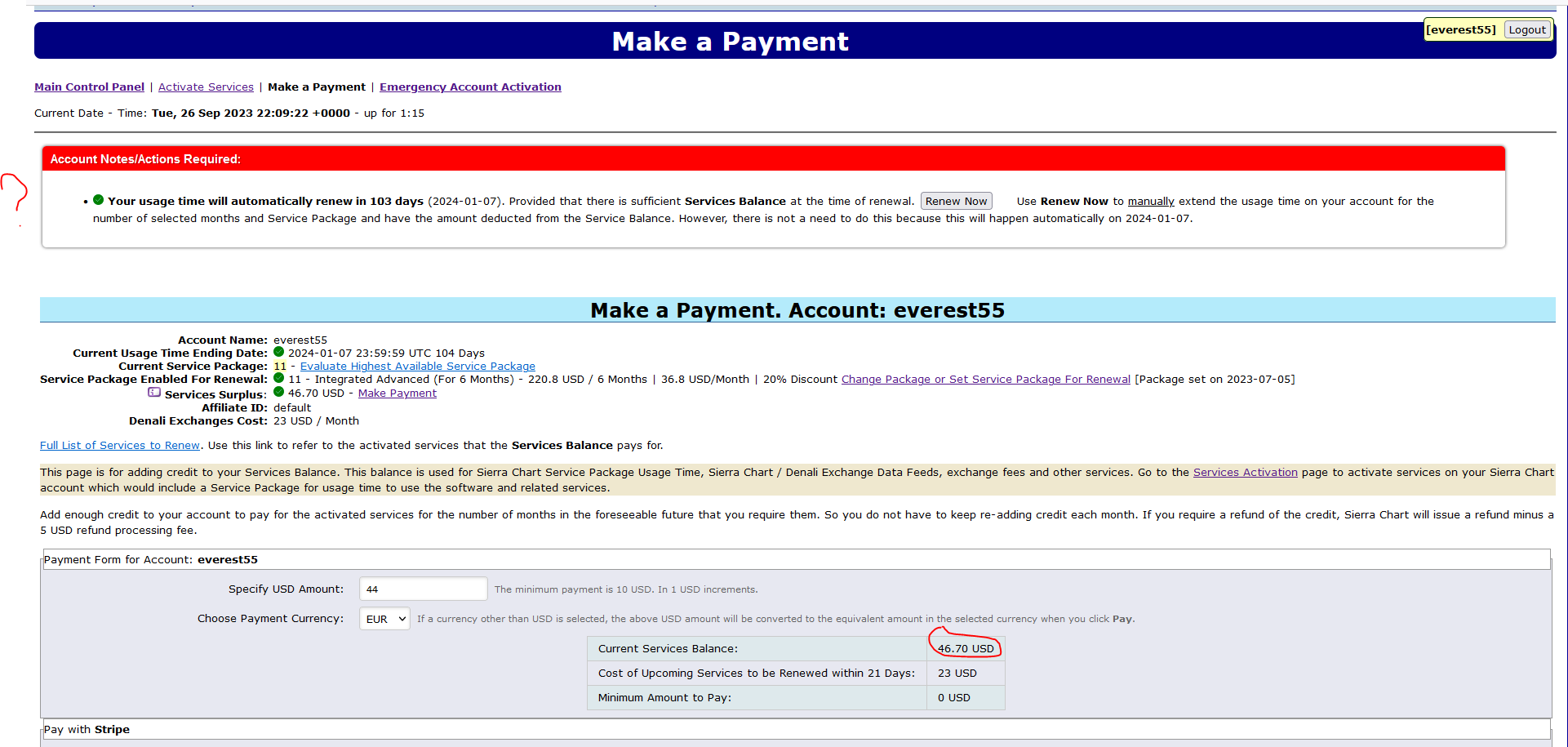 Hi, I have enough money to pay for next month and another month but still there is a warning message. I only access to CME currency future and COMEX (GC) which cost 11.5 X 2 = 23 dollor per month and I have more than 46 dollor and still getting warning message. Could you check it out? Attached screenshot. |