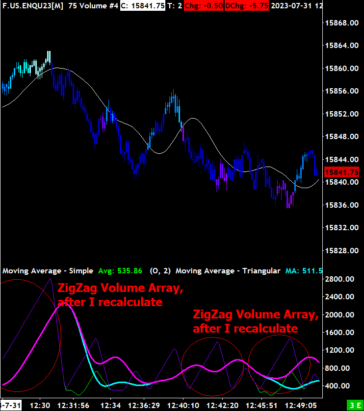 Hey Sierra. I am looking at ZigZag's volume calculation on a volume per bar chart. I am using zigzag in leu of a reversal tick chart. Unfortunately, the zigzag volume calculation / volume array, is continuously stopped (BEFORE the reversal tick is reached). This stopping of the summation of the volume array happens when the price moves down, and then is continued again when the price returns to the trend. Right now, I am using a moving average to track the cumulative volume array. Because the summation of the array stops early, the moving average becomes staggered, and does not fix itself until I refresh / recalculate the chart. I really don't want to recalculate ever time I look at the chart, is there a way to auto recalculate (maybe auto-recalculate the ma?), or to stop the Zigag from ending the summation array before the reversal tick is reached? Before Recalculate https://www.sierrachart.com/image.php?Image=1690822157611.png After Recalculate https://www.sierrachart.com/image.php?Image=1690822233488.png |